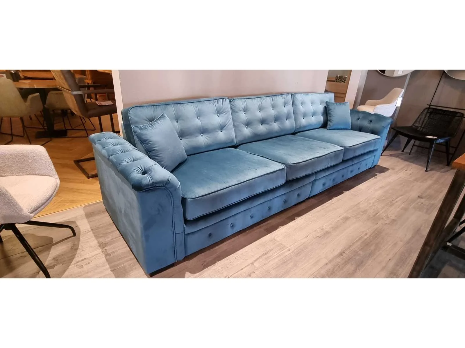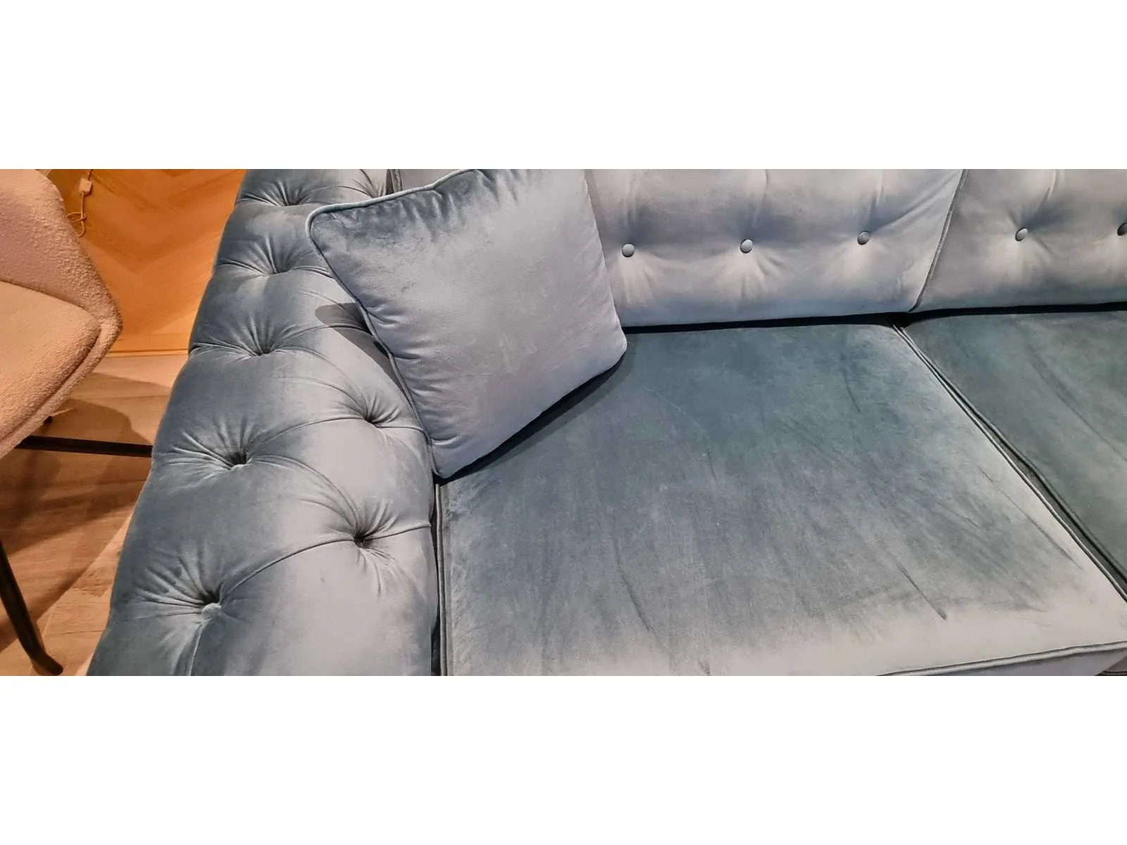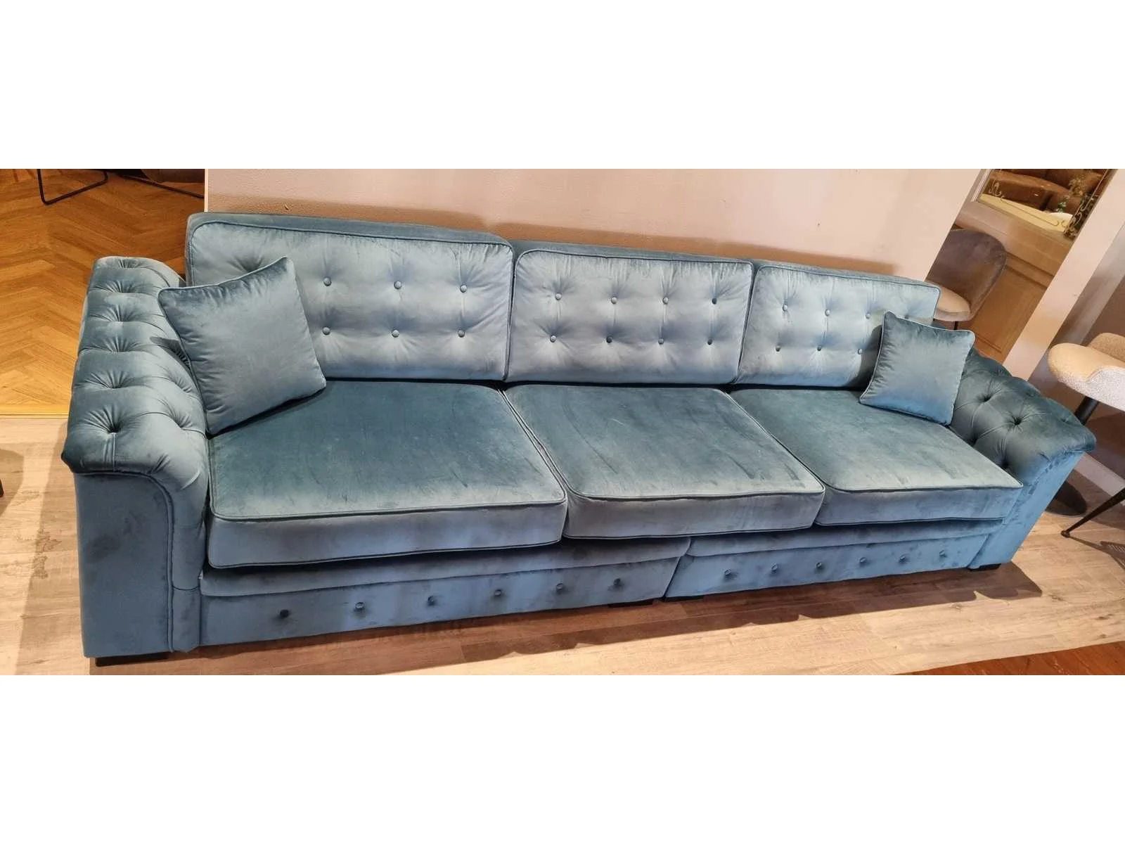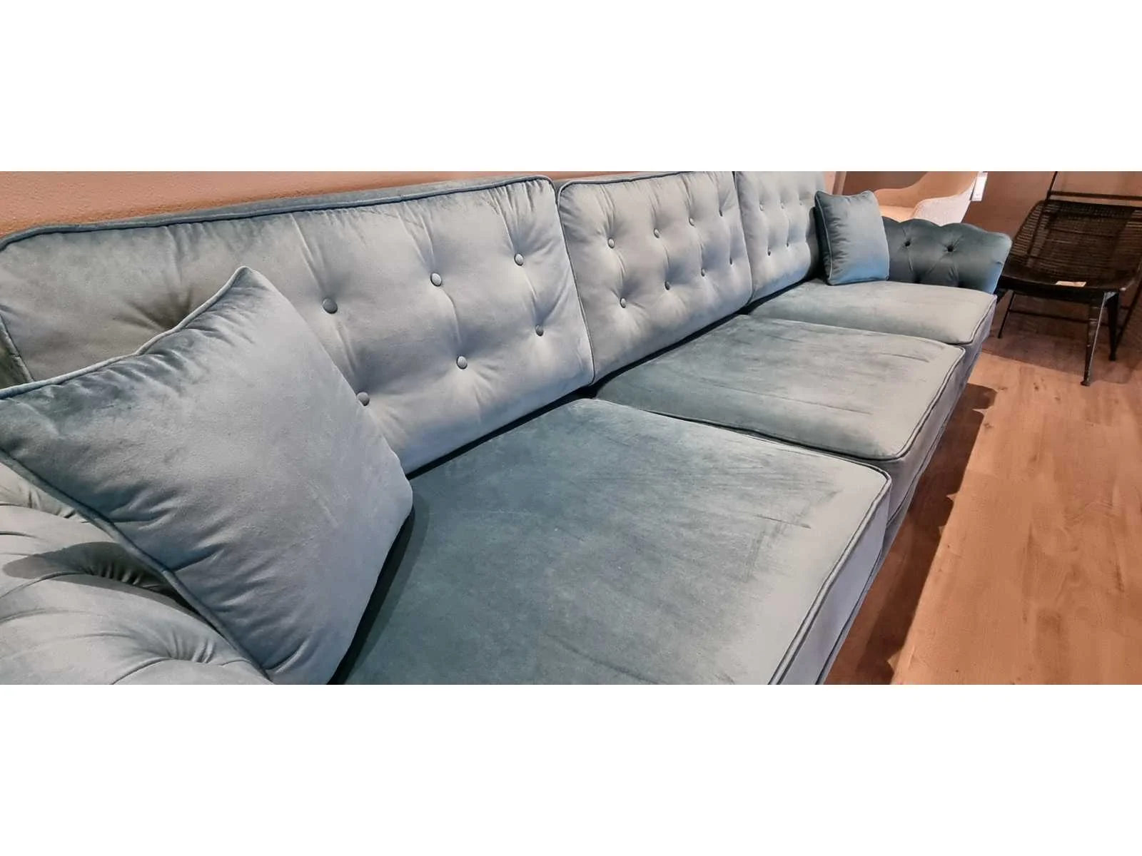 Kussens gevuld met koudschuim Model: Maya Zitplaatsen: 4 Kleur: Blauw Lengte: 385cm Breedte: 95cm Hoogte: 85cm Zithoogte: 47cm Diepte: 61cm Materiaal: Velvet / Adore