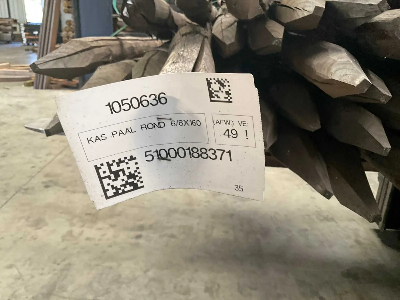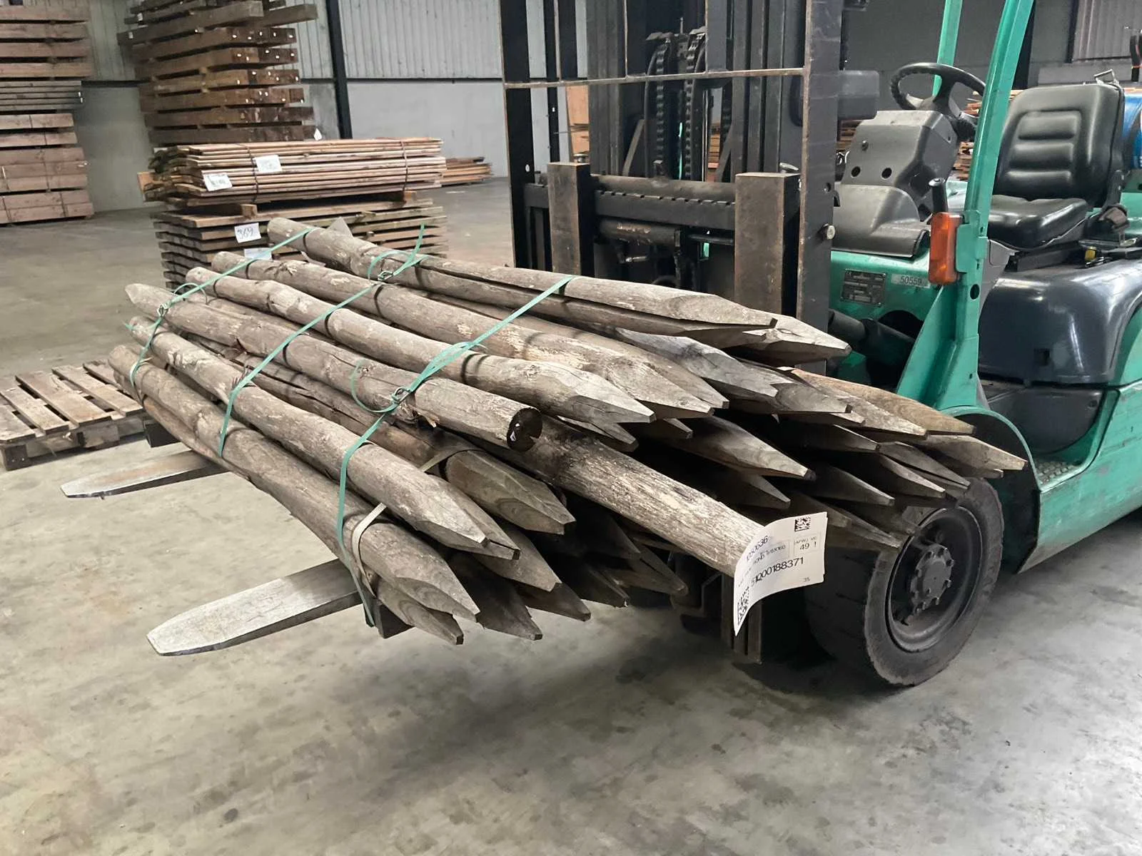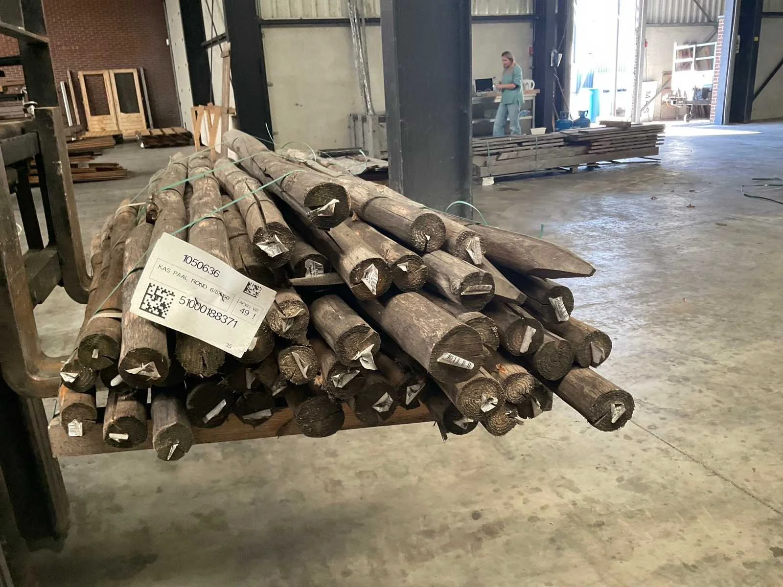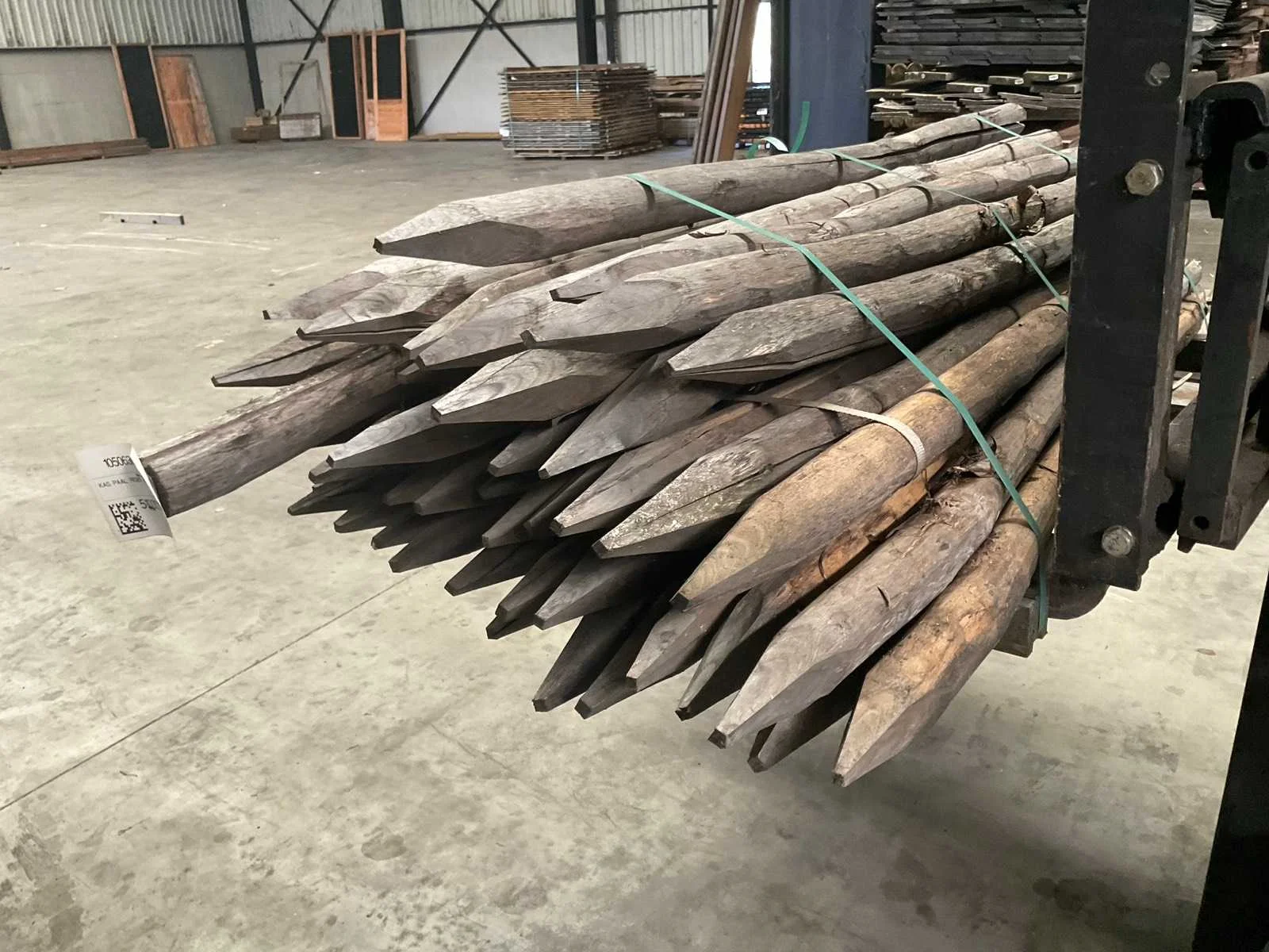 Kastanje tuinpaal rond gepunt 160x7x7 cm, zie foto's voor details. Houtsoort: Kastanje Breedte: 70mm Hoogte: 1600mm Gewicht: 175kg