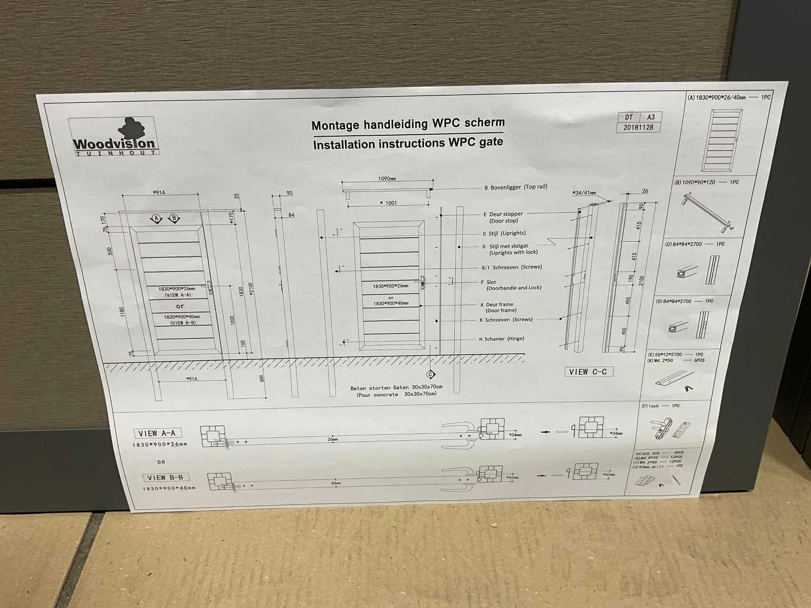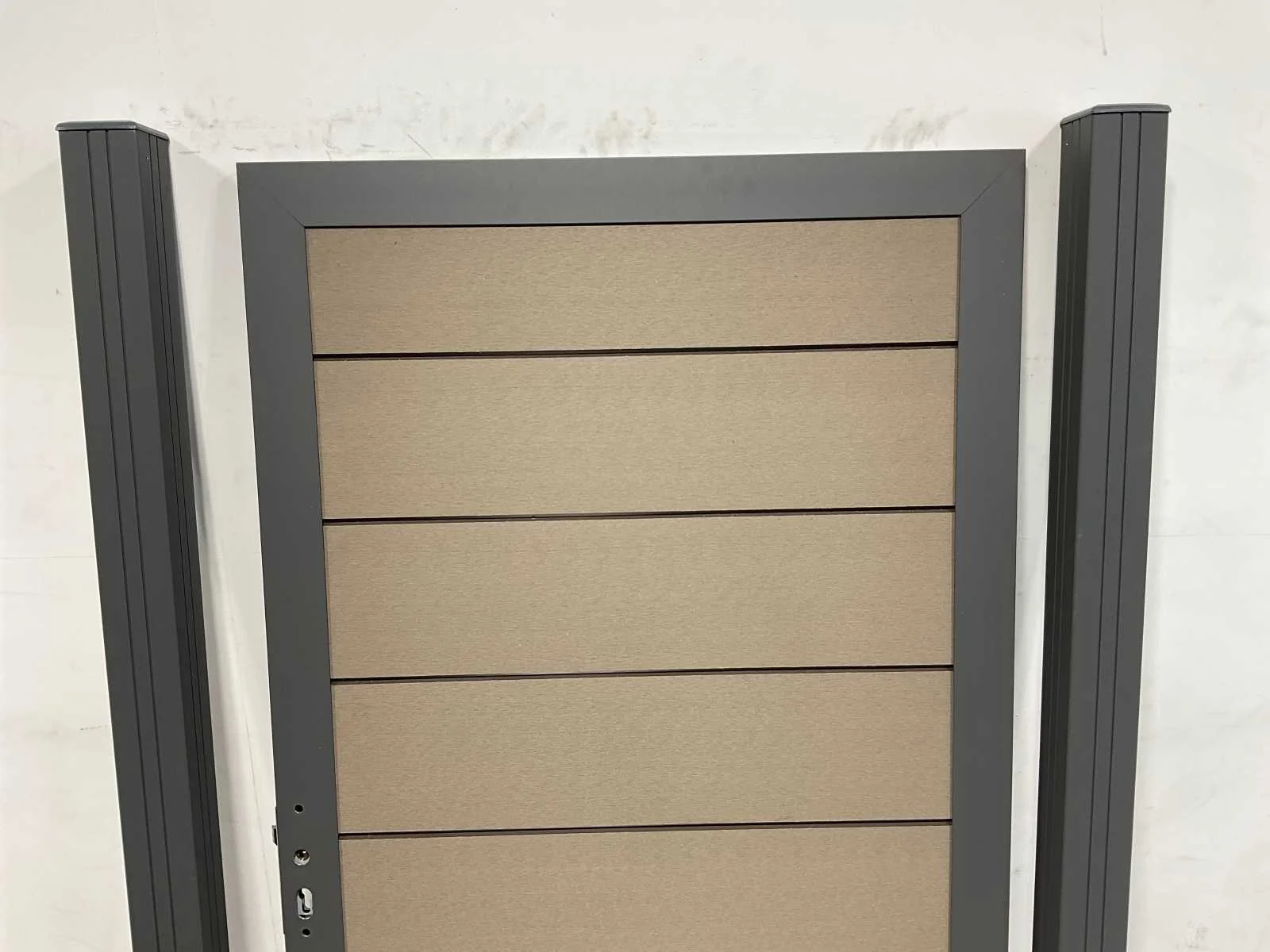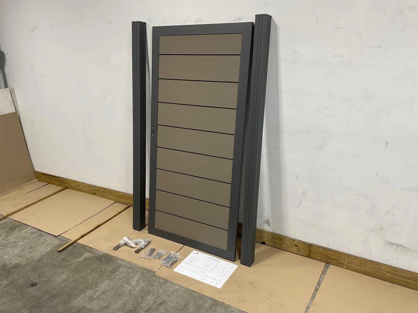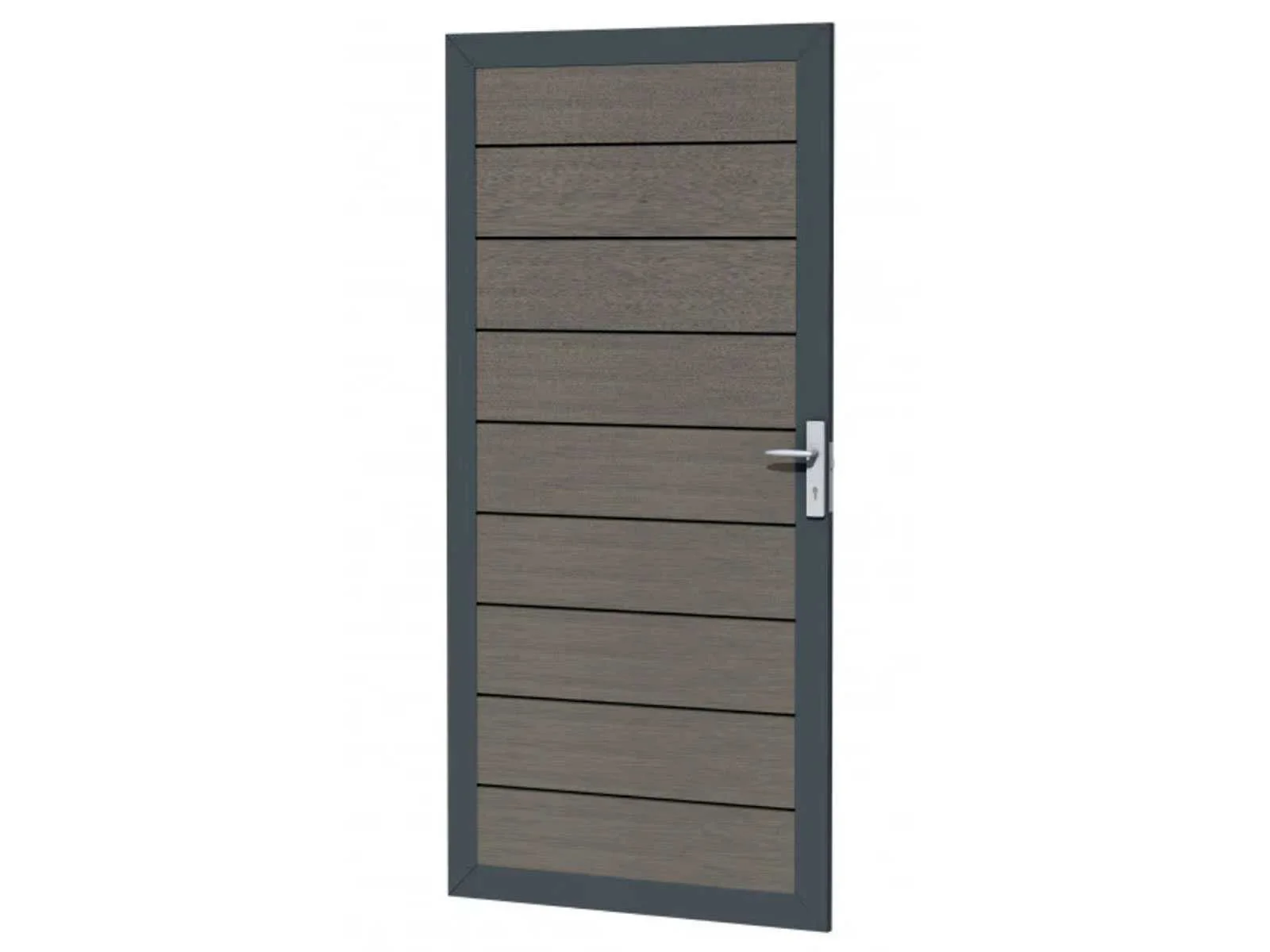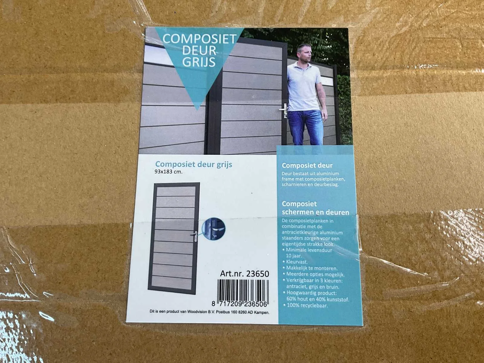 Kavel bevat: 1x Deur met composiet binnenwerk in aluminium frame (183 x 90 cm) 1x Hang-en sluitwerk Let op: Wordt geleverd ZONDER palen. Buitendeur: true Stomp: true Afmeting h: 1830mm Afmeting b: 930mm Kleur: Grijs