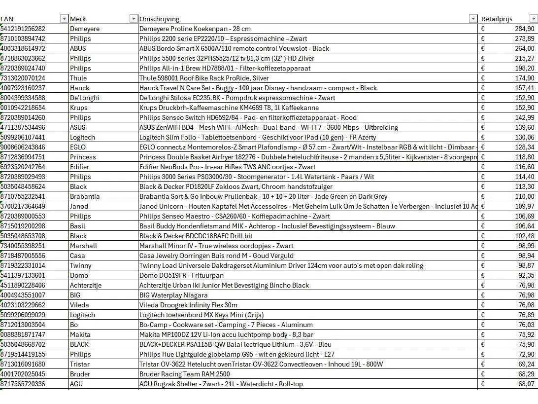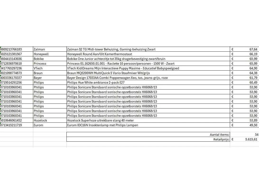 Dit betreft een partij A-merk retourgoederen van een grote online retailer. De partij bestaat uit diverse productcategorieën. Aantal stuks: 54. Retailwaarde: €5616,- Ongecontroleerd: werking onbekend (mix van werkend, incompleet, beschadigd, te gebruiken voor onderdelen). Kom op de kijkdag om te om zo een goed beeld te krijgen van de reden van retour. Zie foto's voor lijst met inhoud. Bezorgtermijn 14 dagen Merk: Pallet Retourgoederen