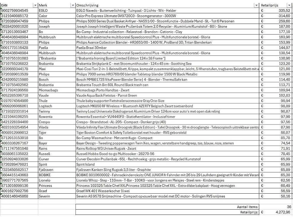 Dit betreft een partij A-merk retourgoederen van een grote online retailer. De partij bestaat uit diverse productcategorieën. Aantal stuks: 36. Retailwaarde: €4273,- Ongecontroleerd: werking onbekend (mix van werkend, incompleet, beschadigd, te gebruiken voor onderdelen). Kom op de kijkdag om te om zo een goed beeld te krijgen van de reden van retour. Zie foto's voor lijst met inhoud. Bezorgtermijn 14 dagen Merk: Pallet Retourgoederen