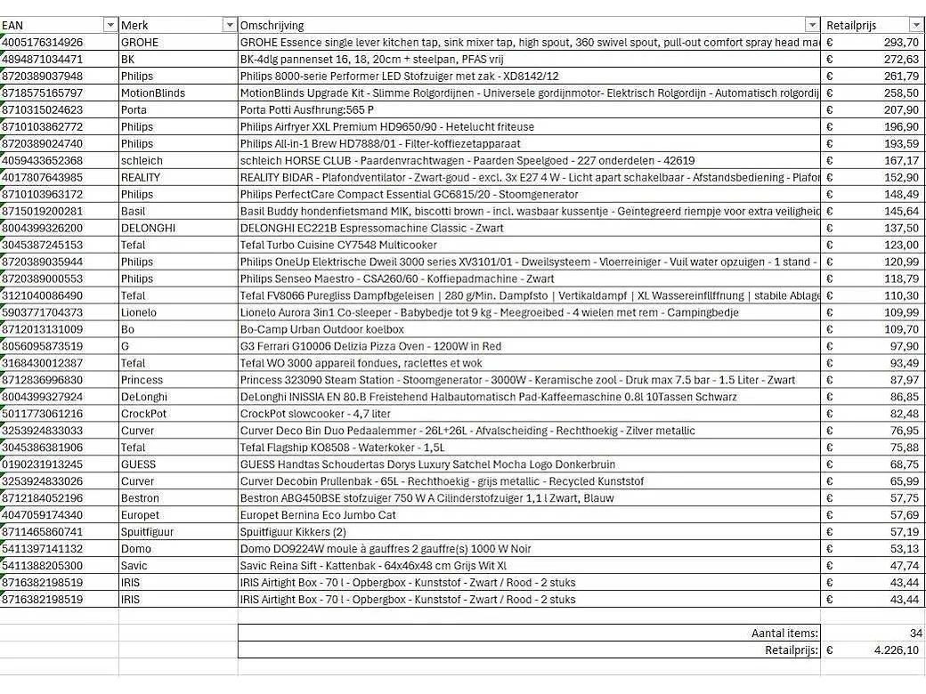 Dit betreft een partij A-merk retourgoederen van een grote online retailer. De partij bestaat uit diverse productcategorieën. Aantal stuks: 34. Retailwaarde: €4226,- Ongecontroleerd: werking onbekend (mix van werkend, incompleet, beschadigd, te gebruiken voor onderdelen). Kom op de kijkdag om te om zo een goed beeld te krijgen van de reden van retour. Zie foto's voor lijst met inhoud. Bezorgtermijn 14 dagen Merk: Pallet Retourgoederen