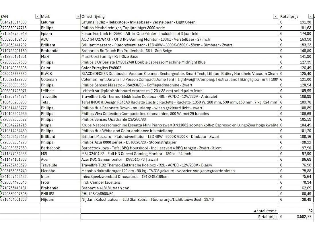 Dit betreft een partij A-merk retourgoederen van een grote online retailer. De partij bestaat uit diverse productcategorieën. Aantal stuks: 32. Retailwaarde: €3583,- Ongecontroleerd: werking onbekend (mix van werkend, incompleet, beschadigd, te gebruiken voor onderdelen). Kom op de kijkdag om te om zo een goed beeld te krijgen van de reden van retour. Zie foto's voor lijst met inhoud. Bezorgtermijn 14 dagen Merk: Pallet Retourgoederen