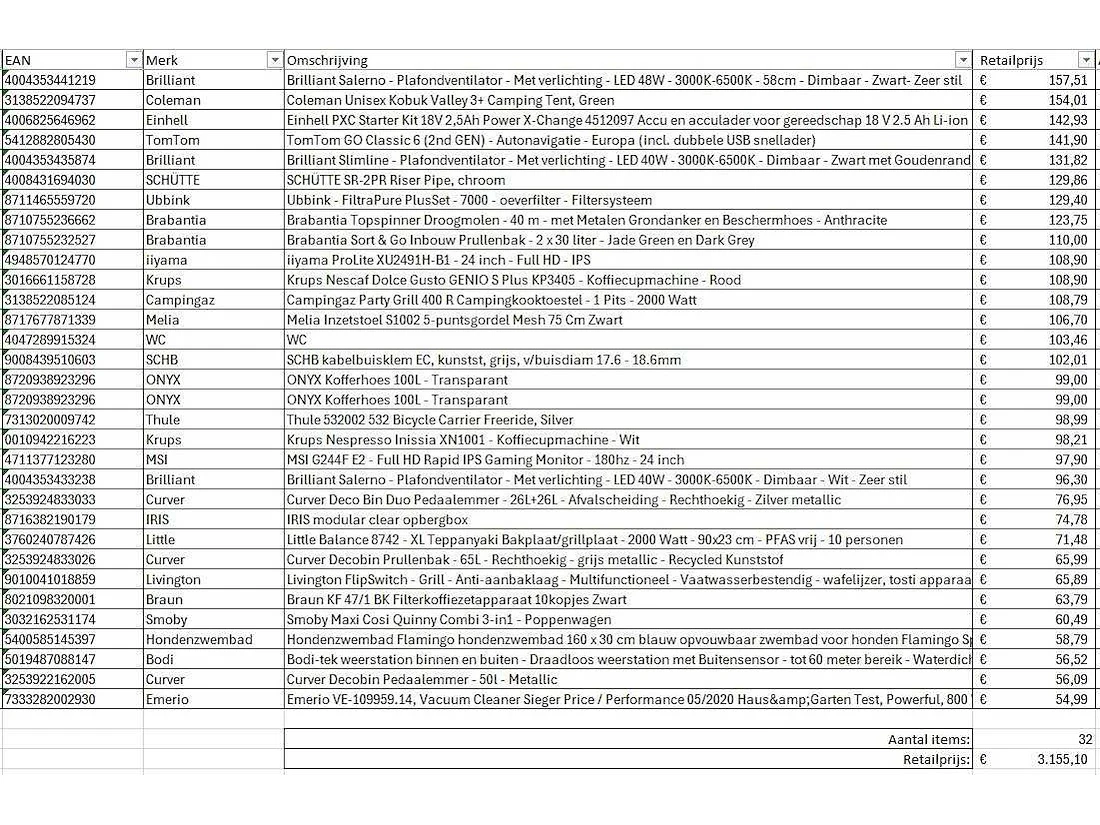 Dit betreft een partij A-merk retourgoederen van een grote online retailer. De partij bestaat uit diverse productcategorieën. Aantal stuks: 32. Retailwaarde: €3155,- Ongecontroleerd: werking onbekend (mix van werkend, incompleet, beschadigd, te gebruiken voor onderdelen). Kom op de kijkdag om te om zo een goed beeld te krijgen van de reden van retour. Zie foto's voor lijst met inhoud. Bezorgtermijn 14 dagen Merk: Pallet Retourgoederen