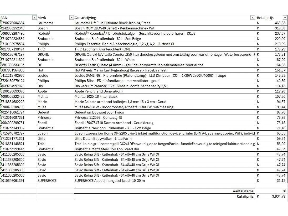 Dit betreft een partij A-merk retourgoederen van een grote online retailer. De partij bestaat uit diverse productcategorieën. Aantal stuks: 31. Retailwaarde: €3935,- Ongecontroleerd: werking onbekend (mix van werkend, incompleet, beschadigd, te gebruiken voor onderdelen). Kom op de kijkdag om te om zo een goed beeld te krijgen van de reden van retour. Zie foto's voor lijst met inhoud. Bezorgtermijn 14 dagen Merk: Pallet Retourgoederen