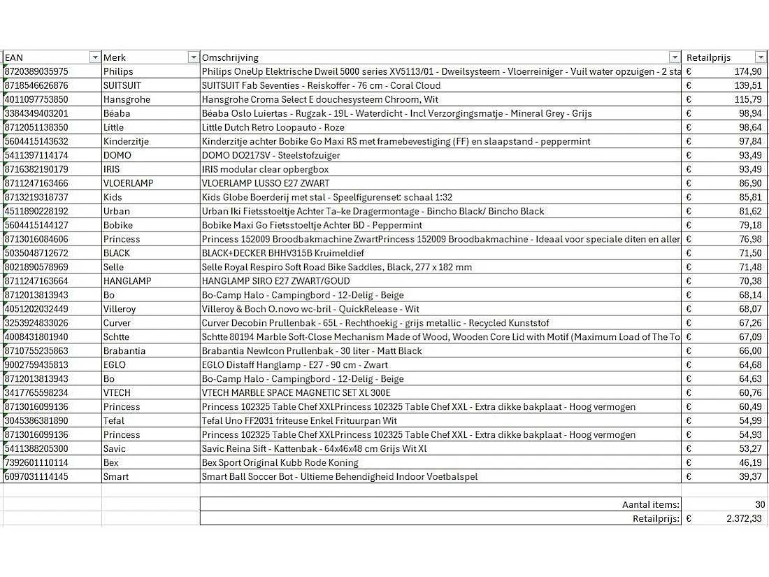Dit betreft een partij A-merk retourgoederen van een grote online retailer. De partij bestaat uit diverse productcategorieën. Aantal stuks: 30. Retailwaarde: €2372,- Ongecontroleerd: werking onbekend (mix van werkend, incompleet, beschadigd, te gebruiken voor onderdelen). Kom op de kijkdag om te om zo een goed beeld te krijgen van de reden van retour. Zie foto's voor lijst met inhoud. Bezorgtermijn 14 dagen Merk: Pallet Retourgoederen