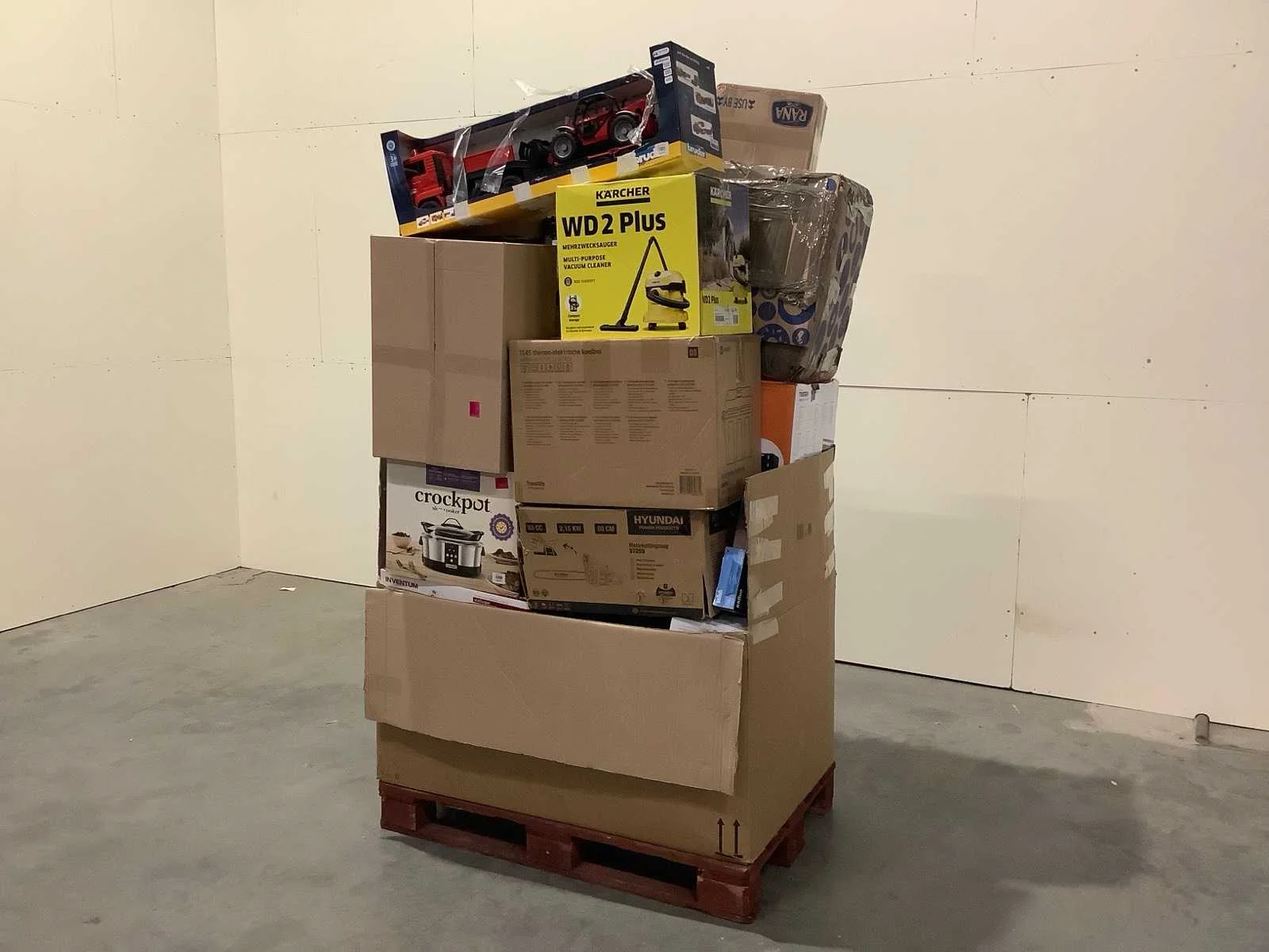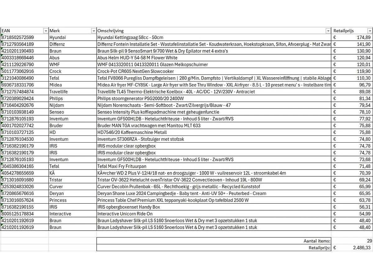 Dit betreft een partij A-merk retourgoederen van een grote online retailer. De partij bestaat uit diverse productcategorieën. Aantal stuks: 29. Retailwaarde: €2486,- Ongecontroleerd: werking onbekend (mix van werkend, incompleet, beschadigd, te gebruiken voor onderdelen). Kom op de kijkdag om te om zo een goed beeld te krijgen van de reden van retour. Zie foto's voor lijst met inhoud. Bezorgtermijn 14 dagen Merk: Pallet Retourgoederen