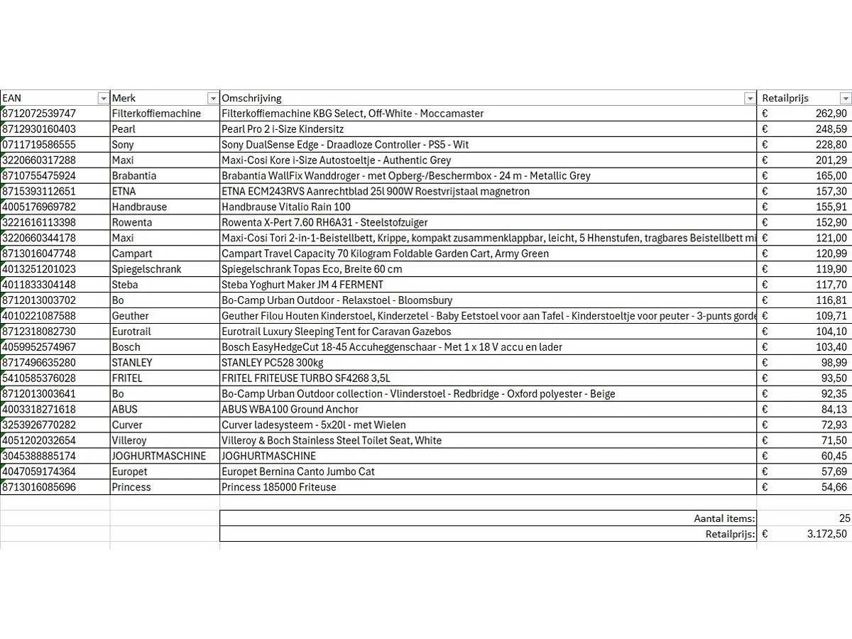Dit betreft een partij A-merk retourgoederen van een grote online retailer. De partij bestaat uit diverse productcategorieën. Aantal stuks: 25. Retailwaarde: €3172,- Ongecontroleerd: werking onbekend (mix van werkend, incompleet, beschadigd, te gebruiken voor onderdelen). Kom op de kijkdag om te om zo een goed beeld te krijgen van de reden van retour. Zie foto's voor lijst met inhoud. Bezorgtermijn 14 dagen Merk: Pallet Retourgoederen