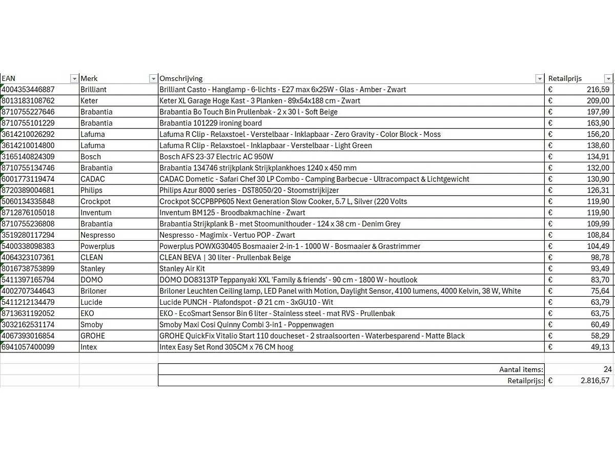 Dit betreft een partij A-merk retourgoederen van een grote online retailer. De partij bestaat uit diverse productcategorieën. Aantal stuks: 24. Retailwaarde: €2817,- Ongecontroleerd: werking onbekend (mix van werkend, incompleet, beschadigd, te gebruiken voor onderdelen). Kom op de kijkdag om te om zo een goed beeld te krijgen van de reden van retour. Zie foto's voor lijst met inhoud. Bezorgtermijn 14 dagen Merk: Pallet Retourgoederen