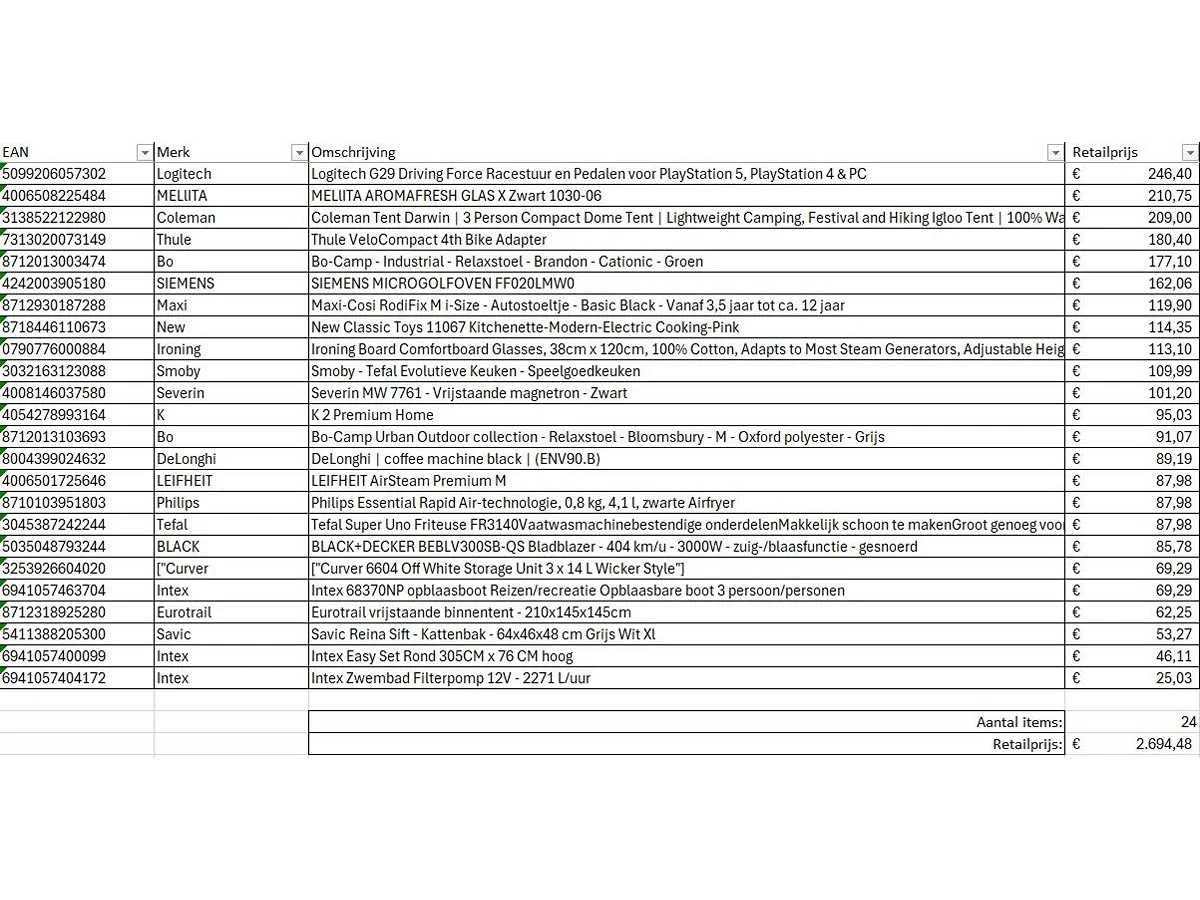 Dit betreft een partij A-merk retourgoederen van een grote online retailer. De partij bestaat uit diverse productcategorieën. Aantal stuks: 24. Retailwaarde: €2694,- Ongecontroleerd: werking onbekend (mix van werkend, incompleet, beschadigd, te gebruiken voor onderdelen). Kom op de kijkdag om te om zo een goed beeld te krijgen van de reden van retour. Zie foto's voor lijst met inhoud. Bezorgtermijn 14 dagen Merk: Pallet Retourgoederen