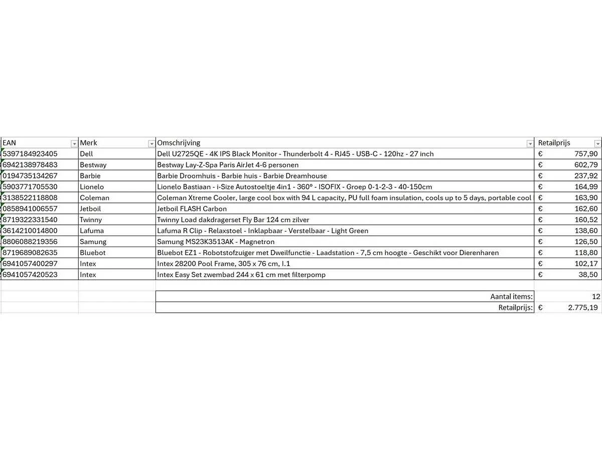 Dit betreft een partij A-merk retourgoederen van een grote online retailer. De partij bestaat uit diverse productcategorieën. Aantal stuks: 12. Retailwaarde: €2775,- Ongecontroleerd: werking onbekend (mix van werkend, incompleet, beschadigd, te gebruiken voor onderdelen). Kom op de kijkdag om te om zo een goed beeld te krijgen van de reden van retour. Zie foto's voor lijst met inhoud. Bezorgtermijn 14 dagen Merk: Pallet Retourgoederen