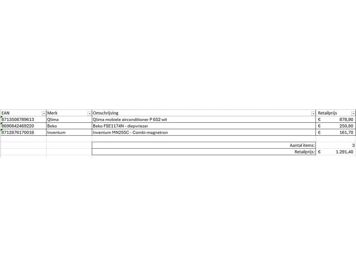 Dit betreft een partij A-merk retourgoederen van een grote online retailer. De partij bestaat uit diverse productcategorieën. Aantal stuks: 3. Retailwaarde: €1291,- Ongecontroleerd: werking onbekend (mix van werkend, incompleet, beschadigd, te gebruiken voor onderdelen). Kom op de kijkdag om te om zo een goed beeld te krijgen van de reden van retour. Zie foto's voor lijst met inhoud. Bezorgtermijn 14 dagen Merk: Pallet Retourgoederen