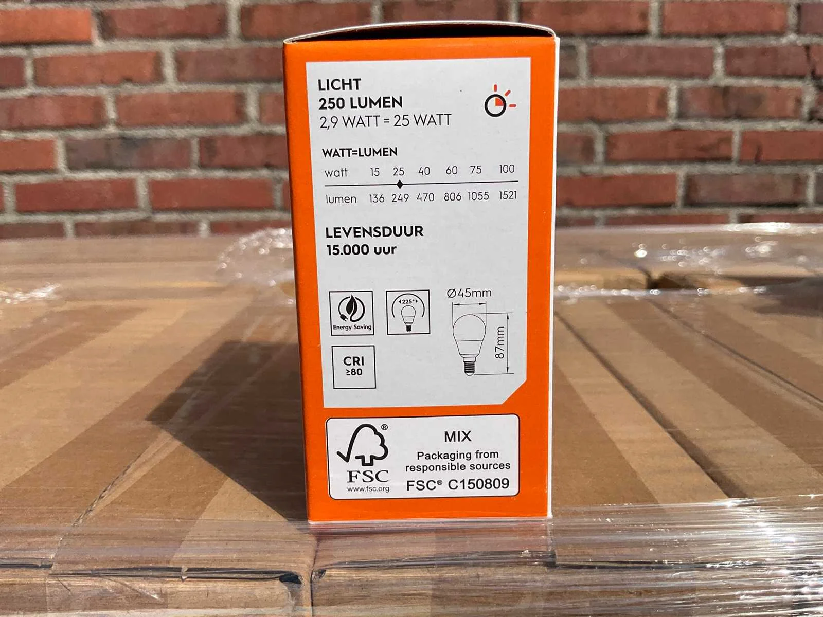 De LED-lichtbron 2-pack bevat twee lampen met een kleurtemperatuur van 2700 Kelvin, wat zorgt voor warm wit licht. De lampen werken op een spanning van 220-240 volt en zijn geschikt voor gebruik in armaturen met een bijpassende fitting. Dankzij LED-technologie bieden ze directe lichtopbrengst en een langere levensduur dan traditionele gloeilampen. Let op: in dit kavel zitten 287 dozen LED spots. Iedere doos bevat 6 stuks 2-packs. Dit is een totaal van 3440 lichtbronnen. Één doos is niet volledig gevuld. Model: 2-pack Product type: LED lichtbron Vorm: kogel Spanning: 220-240V Kleurtemperatuur: 2700K Lichtbron: LED Lichtopbrengst: 250lm Diameter circa: 45mm Fitting: E14 Wattage: 2,9W Kleur: wit Lengte: 4,5cm Breedte: 4,5cm Hoogte: 8,7cm