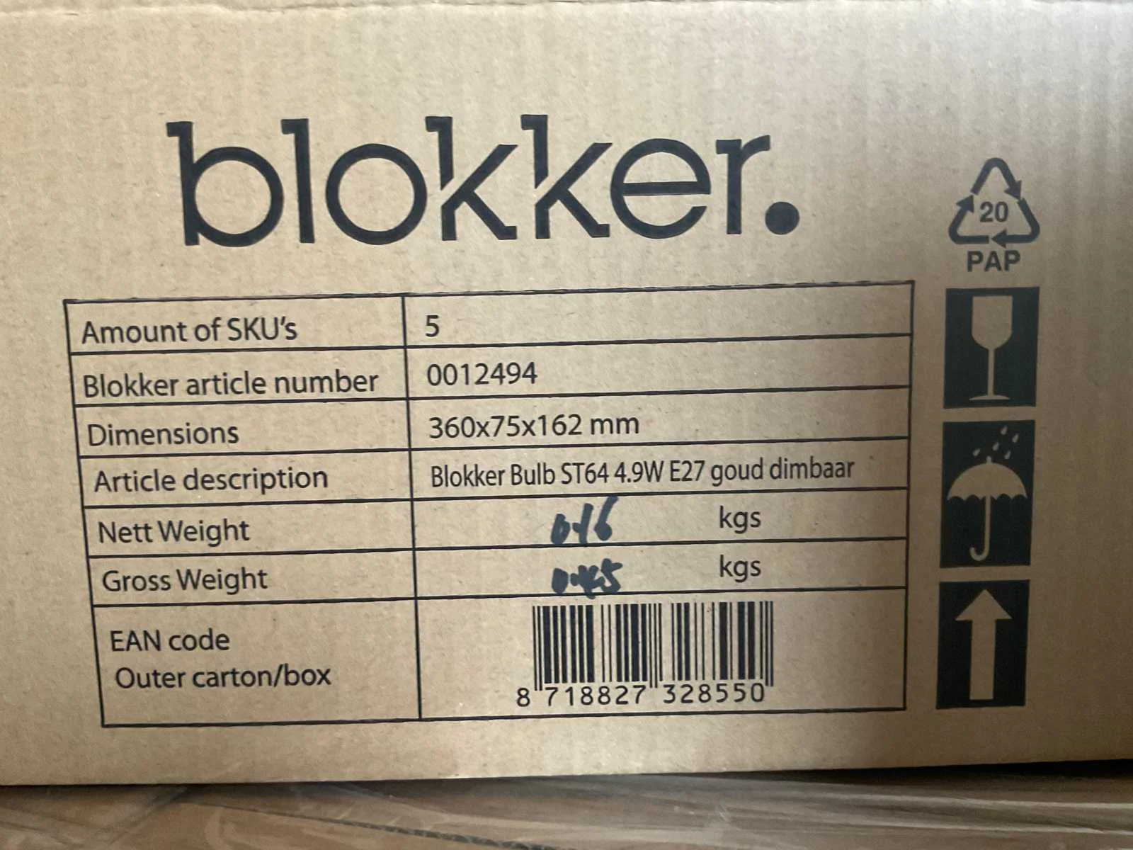 De LED-lichtbron met E27-fitting heeft een vermogen van 4,9 watt en werkt op een spanning van 220-240 volt. De lamp is dimbaar, heeft een lichtopbrengst van 400 lumen en een kleurtemperatuur van 2200 Kelvin, wat zorgt voor extra warm wit licht. Dankzij LED-technologie levert de lamp directe lichtopbrengst en heeft deze een langere levensduur dan traditionele gloeilampen. Let op, dit kavel heeft een totale voorraad van 2421 lichtbronnen. Deze zijn verdeeld over 485 dozen van 5 stuks, waarvan één doos niet volledig is gevuld. Model: LED Product type: lichtbron Vorm: Edison Spanning: 220-240V Kleurtemperatuur: 2200K Lichtbron: LED Lichtopbrengst: 400lm Diameter circa: 64mm Energielabel: G Fitting: E27 Dimbaar: true Wattage: 4,9W Kleur: goud Lengte: 6,4cm Breedte: 6,4cm Hoogte: 14cm