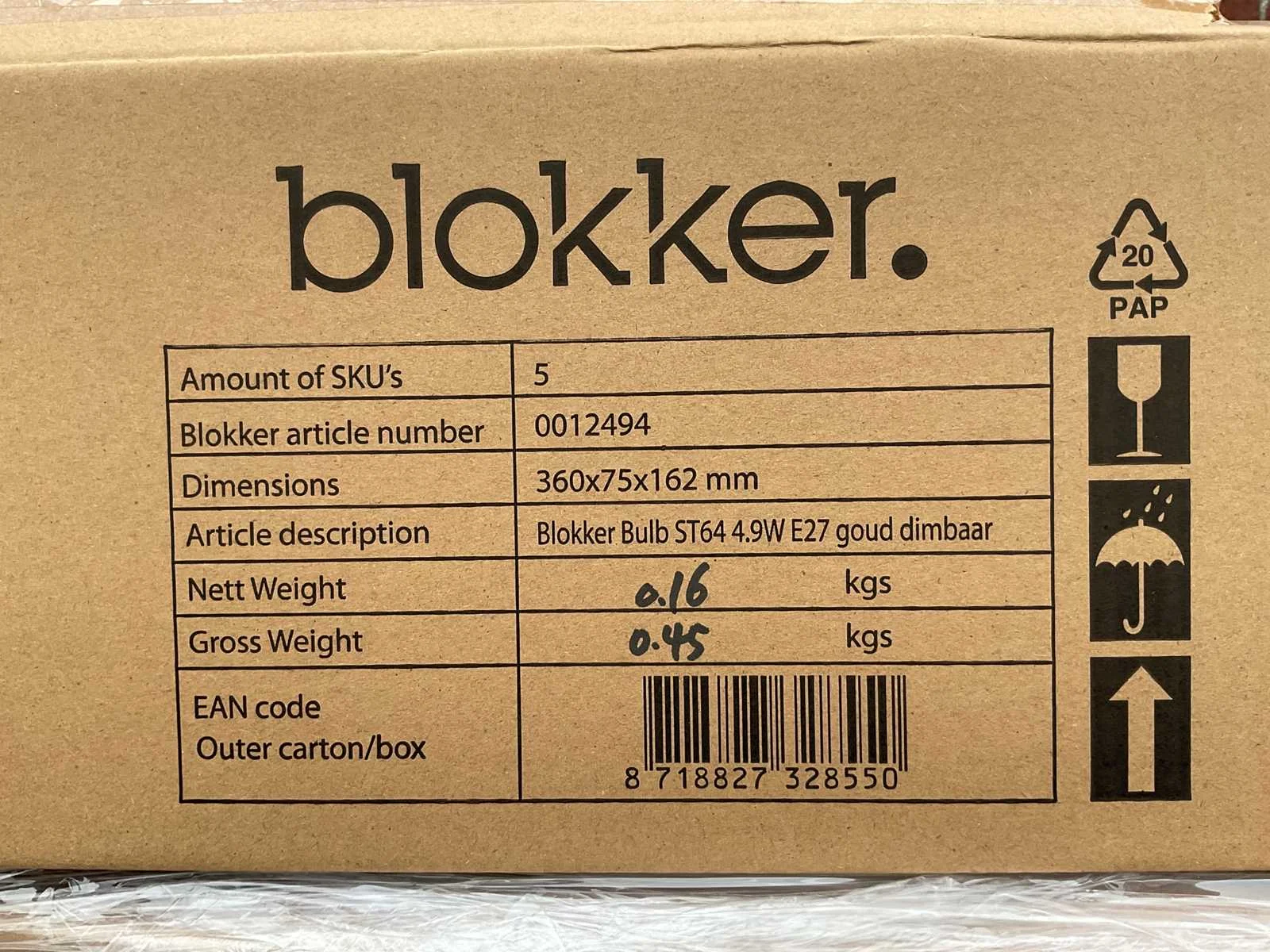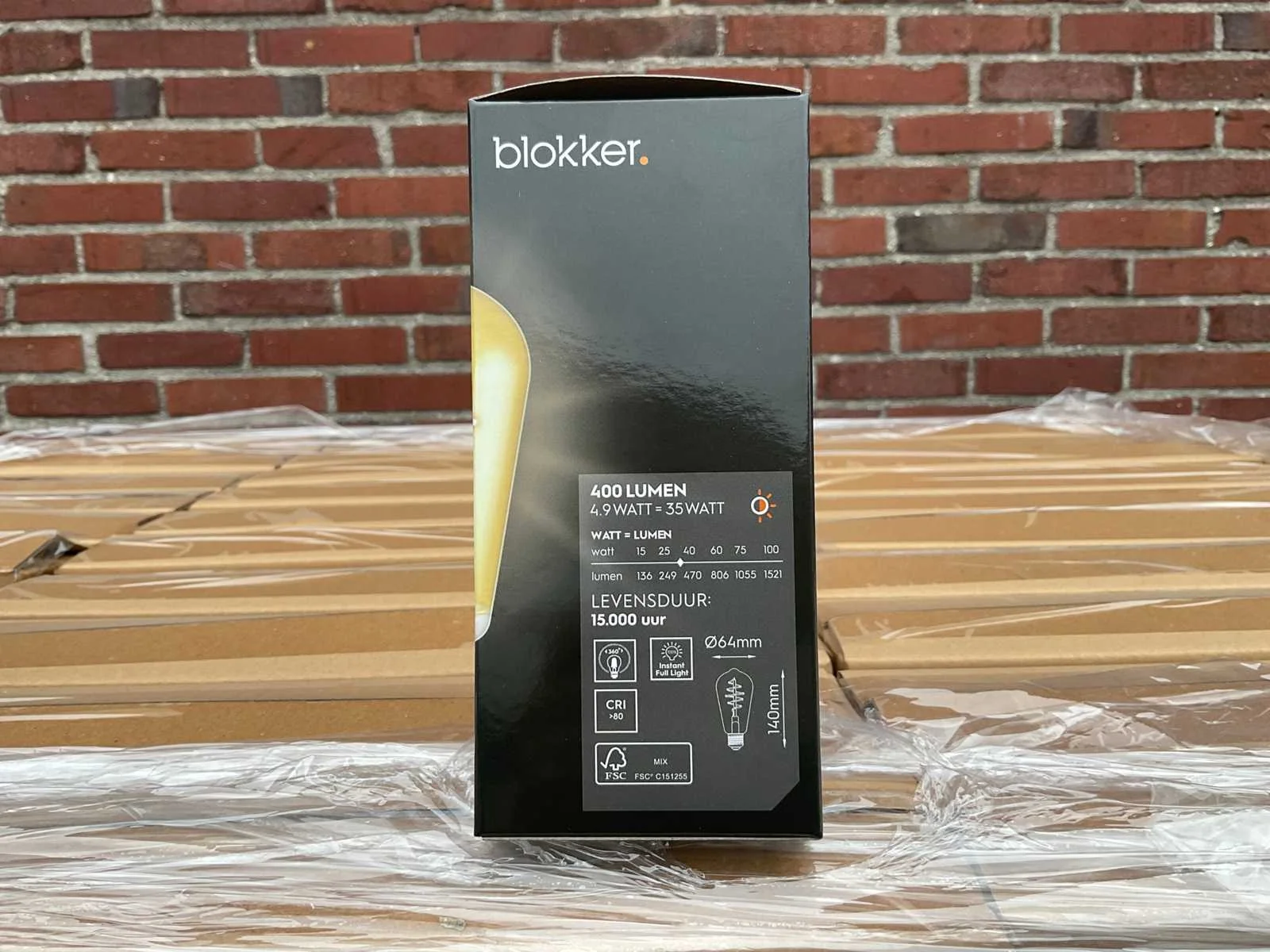 De LED-lichtbron met E27-fitting heeft een vermogen van 4,9 watt en werkt op een spanning van 220-240 volt. De lamp is dimbaar, heeft een lichtopbrengst van 400 lumen en een kleurtemperatuur van 2200 Kelvin, wat zorgt voor extra warm wit licht. Dankzij LED-technologie levert de lamp directe lichtopbrengst en heeft een langere levensduur dan traditionele gloeilampen. Let op, dit kavel heeft een totale voorraad van 1600 lichtbronnen. Deze zijn verdeeld over 320 dozen van 5 stuks. Model: LED Product type: lichtbron Vorm: Edison Spanning: 220-240V Kleurtemperatuur: 2200K Lichtbron: LED Lichtopbrengst: 400lm Diameter circa: 64mm Energielabel: G Fitting: E27 Dimbaar: true Wattage: 4,9W Kleur: goud Lengte: 6,4cm Breedte: 6,4cm Hoogte: 14cm