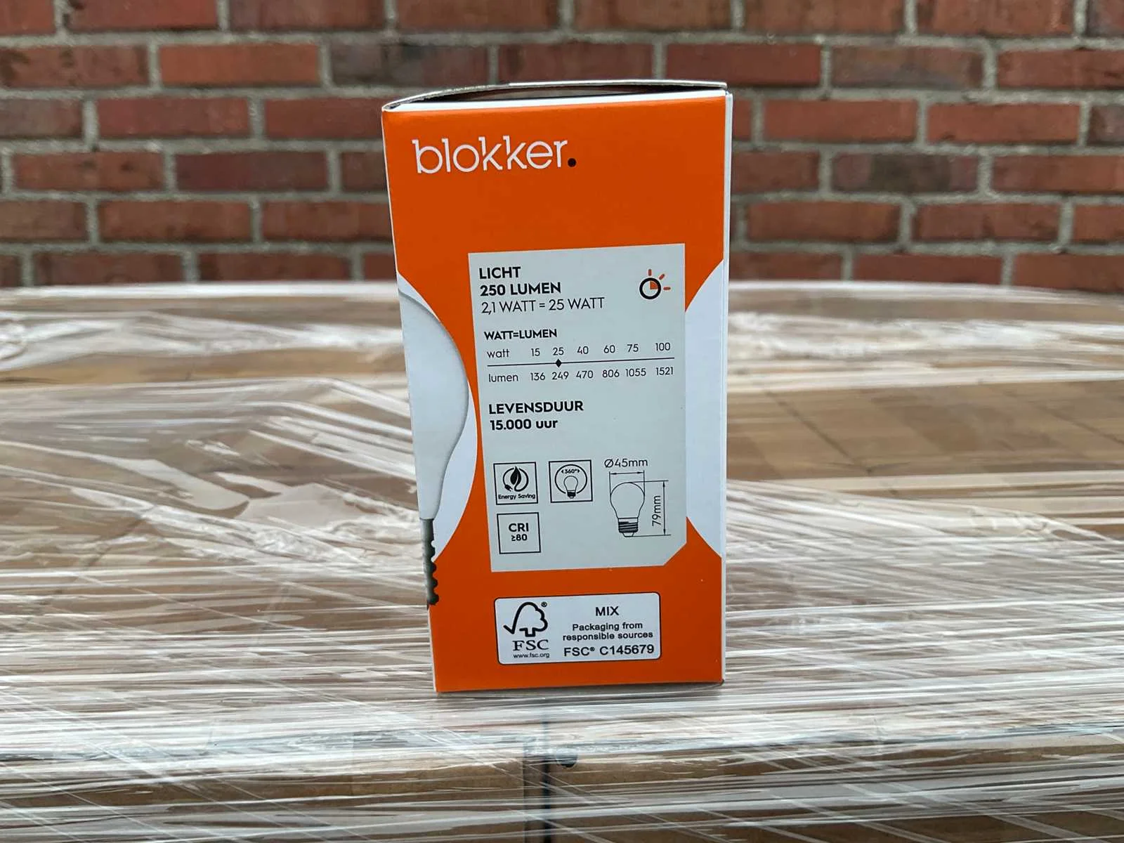 De LED-lichtbron met E27-fitting heeft een vermogen van 2,1 watt en werkt op een spanning van 220-240 volt. De lamp levert 250 lumen licht met een kleurtemperatuur van 2700 Kelvin, wat zorgt voor warm wit licht. Dankzij LED-technologie biedt de lamp directe lichtopbrengst en een langere levensduur dan traditionele gloeilampen. Let op, dit kavel heeft een totale voorraad van 2064 lichtbronnen. Deze zijn verdeeld over 344 dozen van 6 stuks. Model: LED lichtbron Vorm: kogellamp Spanning: 220-240V Kleurtemperatuur: 2700K Lichtbron: LED Lichtopbrengst: 250lm Diameter circa: 45mm Energielabel: E Fitting: E27 Wattage: 2,1W Kleur: wit Lengte: 4,5cm Breedte: 4,5cm Hoogte: 7,9cm