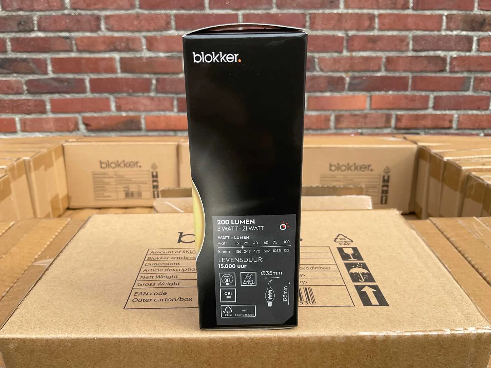 De LED lichtbron met E14-fitting heeft een vermogen van 3 watt en werkt op een spanning van 220-240 volt. De lamp is dimbaar en geeft extra warm licht met een kleurtemperatuur van 2200 Kelvin. Met een lichtopbrengst van 200 lumen is deze lichtbron geschikt voor sfeerverlichting. De lamp heeft energielabel G en vormt een energiezuinige vervanging voor traditionele gloeilampen. Let op, dit kavel heeft een totale voorraad van 2734 lichtbronnen. Deze zijn verdeeld over 547 dozen van 5 stuks, waarvan één doos niet volledig is gevuld. Model: LED Product type: lichtbron Vorm: kaars met gebogen punt Spanning: 220-240V Kleurtemperatuur: 2200K Lichtbron: LED Lichtopbrengst: 200lm Diameter circa: 35mm Energielabel: G Fitting: E14 Dimbaar: true Wattage: 3W Kleur: goud Lengte: 3,5cm Breedte: 3,5cm Hoogte: 12,3cm