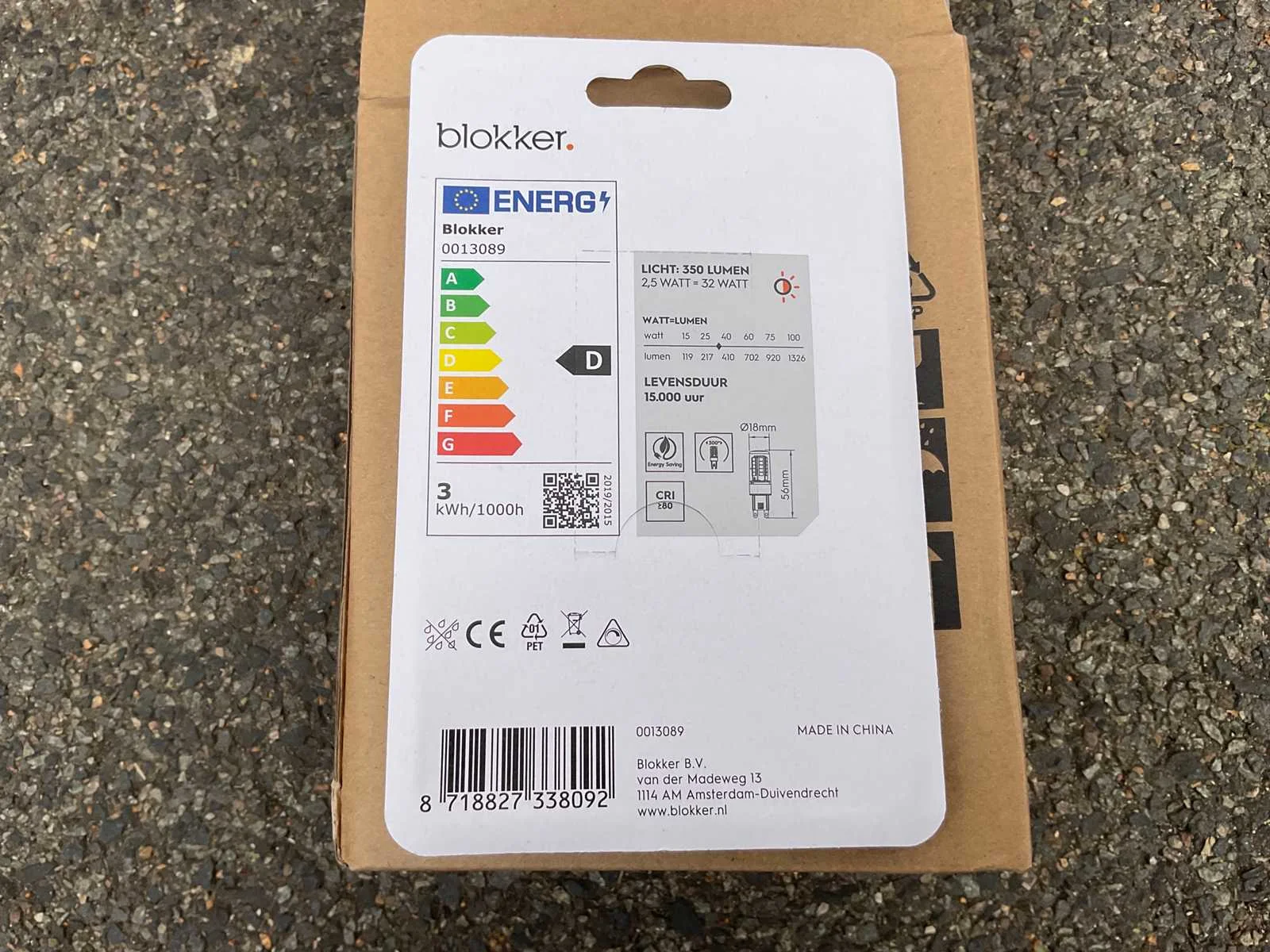 De LED capsulelamp met G9-fitting heeft een vermogen van 2,5 watt en werkt op een spanning van 220-240 volt. De lamp is dimbaar, waardoor de lichtsterkte naar wens kan worden aangepast. De capsulelamp geeft warm wit licht met een kleurtemperatuur van 3000 Kelvin en een lichtopbrengst van 350 lumen. Wordt vaak gebruikt in kleine armaturen, spotjes of designlampen waar weinig ruimte is. Let op, dit kavel heeft een totale voorraad van 6840 lichtbronnen. Deze zijn verdeeld over 684 dozen van 10 stuks. Model: LED Product type: lichtbron Vorm: capsulelamp Spanning: 220-240V Kleurtemperatuur: 3000K Lichtbron: LED Lichtopbrengst: 350lm Diameter circa: 18mm Energielabel: D Fitting: G9 Dimbaar: true Wattage: 2,5W Kleur: helder Lengte: 1,8cm Breedte: 1,8cm Hoogte: 5,6cm