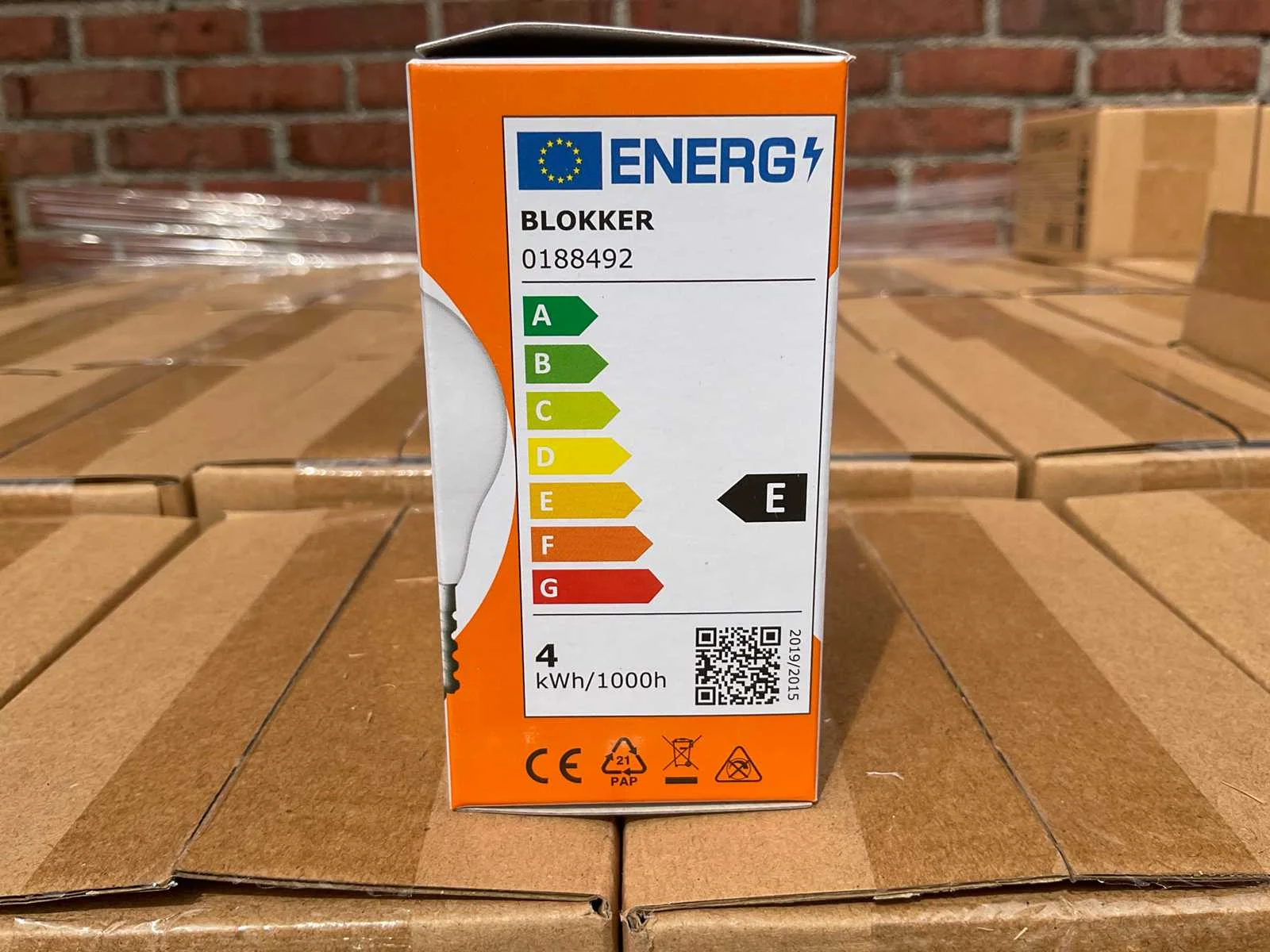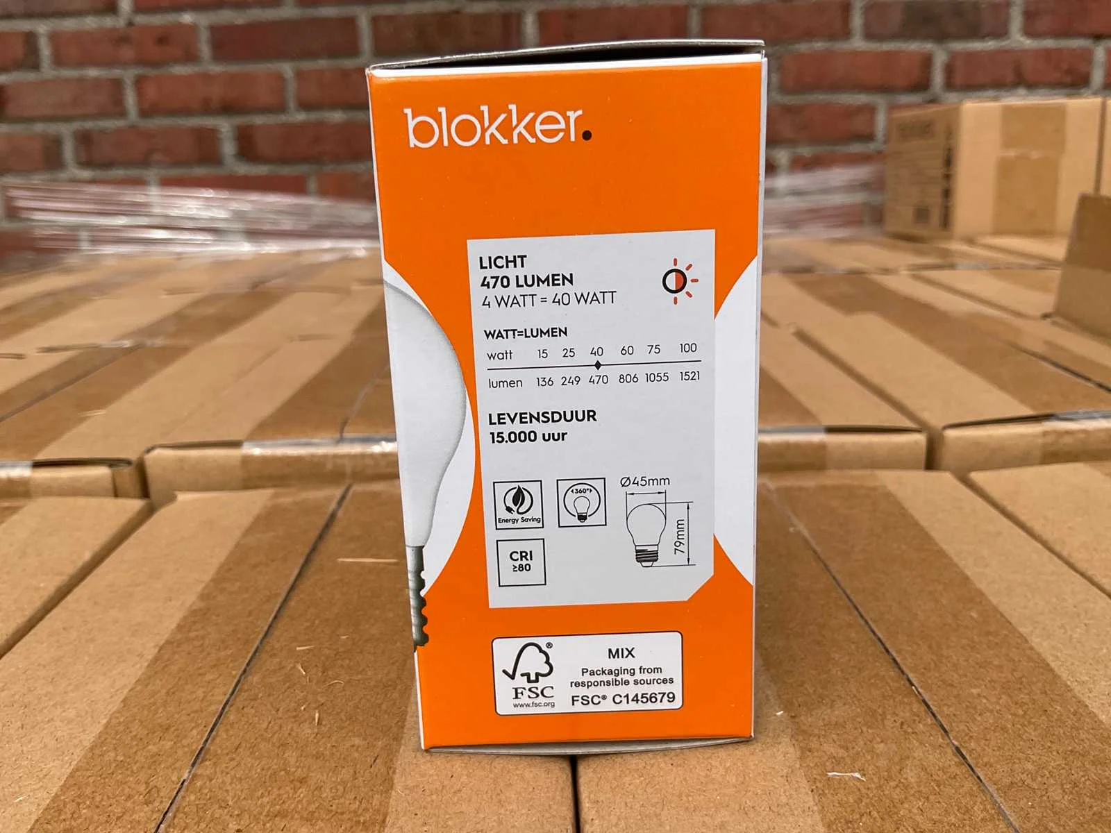 De LED-lichtbron met E27-fitting heeft een vermogen van 4 watt en werkt op een spanning van 220-240 volt. Het energielabel van deze lamp is E. De lamp levert 470 lumen licht met een kleurtemperatuur van 2700 Kelvin, wat zorgt voor warm wit licht. Dankzij de LED-technologie biedt de lamp directe lichtopbrengst en een langere levensduur dan traditionele gloeilampen. Let op: deze kavel betreft een voorraad van 1793, deze is verdeeld in 299 dozen met 6 stuks. Een doos is niet volledig gevuld. Model: LED Product type: lichtbron Vorm: kogel Spanning: 220-240V Kleurtemperatuur: 2700K Lichtbron: LED Lichtopbrengst: 470lm Diameter circa: 45mm Energielabel: E Fitting: E27 Wattage: 4W Lengte: 4,5cm Breedte: 4,5cm Hoogte: 7,9cm