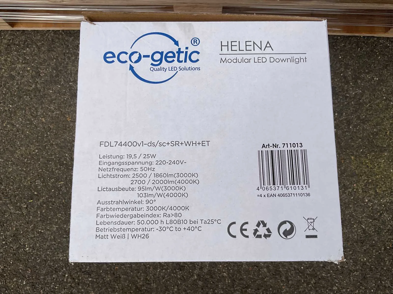 De Eco-Getic Helena is een modulaire LED downlight, ontwikkeld voor efficiënte en flexibele verlichting. Vermogen: schakelbaar tussen 19,5W en 25W. Lichtopbrengst: 1860–2500 lumen (3000K) / 2000–2700 lumen (4000K). Lichtkleur: omschakelbaar tussen warmwit (3000K) en neutraal wit (4000K). Uitstraalhoek: 90° voor brede, gelijkmatige verlichting. Kleurweergave: Ra >80 voor natuurgetrouwe kleurweergave. Behuizing: mat wit (WH26), moderne uitstraling. Inbouwmaat (cut-out): Ø200 mm. Afmetingen: Ø225 mm x H97 mm. Beschermingsklasse: IP20/IP54 (geschikt voor binnenruimtes, spatwaterdicht aan voorzijde). Eenvoudige Installatie met doorlussing (in-out bedrading). Let op, dit kavel heeft een totale voorraad van 288 downlight/spots. Deze zijn verdeeld over 12 overdozen van 24 stuks. Merk: Eco-getic Model: Helena Product type: inbouwspot Met lichtbron: true Fitting: nvt Wattage: 19,5-25W Lichtbron: LED Kleurtemperatuur: 3000-4000 Kleur: wit Lengte: 22,5cm Breedte: 22,5cm Hoogte: 9,7cm Materiaal: aluminium, kunststof