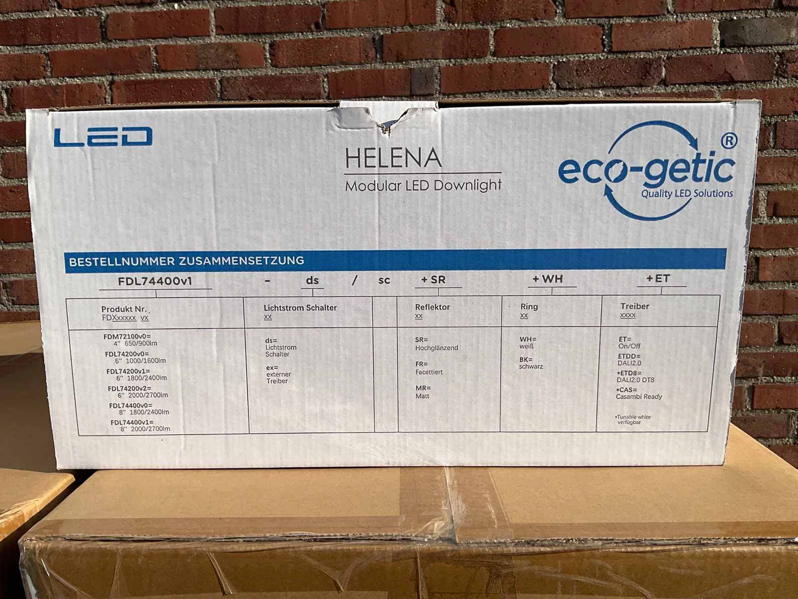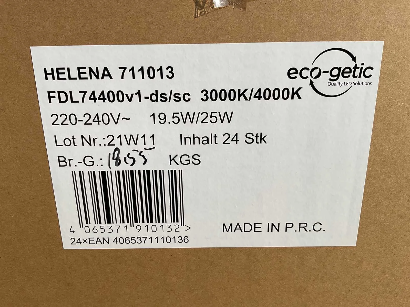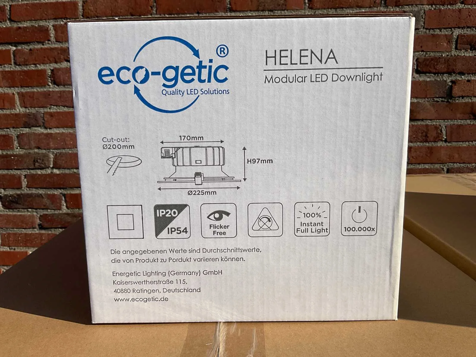 De Eco-Getic Helena is een modulaire LED downlight, ontwikkeld voor efficiënte en flexibele verlichting. Vermogen: schakelbaar tussen 19,5W en 25W. Lichtopbrengst: 1860–2500 lumen (3000K) / 2000–2700 lumen (4000K). Lichtkleur: omschakelbaar tussen warmwit (3000K) en neutraal wit (4000K). Uitstraalhoek: 90° voor brede, gelijkmatige verlichting. Kleurweergave: Ra >80 voor natuurgetrouwe kleurweergave. Behuizing: mat wit (WH26), moderne uitstraling. Inbouwmaat (cut-out): Ø200 mm. Afmetingen: Ø225 mm x H97 mm. Beschermingsklasse: IP20/IP54 (geschikt voor binnenruimtes, spatwaterdicht aan voorzijde). Eenvoudige Installatie met doorlussing (in-out bedrading). Let op: deze kavel betreft een voorraad van 152, deze is verdeeld in 6 dozen met 24 stuks én 2 dozen van 4 stuks. Merk: Eco-getic Model: Helena Product type: inbouwspot Met lichtbron: true Fitting: nvt Wattage: 19,5-25W Lichtbron: LED Kleurtemperatuur: 3000-4000 Kleur: wit Lengte: 22,5cm Breedte: 22,5cm Hoogte: 9,7cm Materiaal: aluminium, kunststof