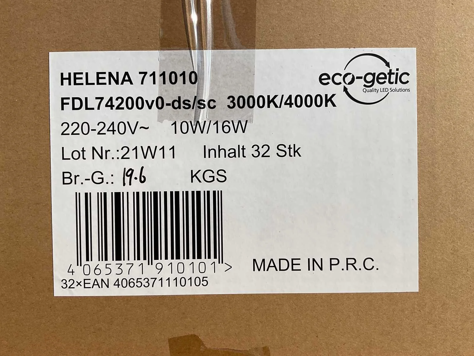 De Eco-Getic Helena is een modulaire LED downlight, ontwikkeld voor flexibele verlichting. Vermogen: schakelbaar tussen 10W en 16W. Lichtopbrengst: 930–1450 lumen (3000K) / 1000–1600 lumen (4000K). Lichtkleur: omschakelbaar tussen warmwit (3000K) en neutraal wit (4000K). Uitstraalhoek: 90° voor brede, gelijkmatige verlichting. Kleurweergave: Ra >80, natuurgetrouwe kleurweergave. Behuizing: aluminium met kunststof afdekking. Inbouwmaat (cut-out): Ø150 mm. Afmetingen: Ø172 mm x H87 mm. Beschermingsklasse: IP20/IP54 (geschikt voor binnenruimtes, spatwaterdicht aan voorzijde). Eenvoudige Installatie met doorlussing (in-out bedrading). Let op, dit kavel heeft een totale voorraad van 480 lichtbronnen. Deze zijn verdeeld over 15 dozen van 32 stuks. Merk: Eco-getic Model: Helena Product type: inbouwspot Met lichtbron: true Fitting: nvt Wattage: 10-16W Lichtbron: LED Kleurtemperatuur: 3000-4000 Kleur: wit Lengte: 17,2cm Breedte: 17,2cm Hoogte: 8,7cm Materiaal: aluminium, kunststof