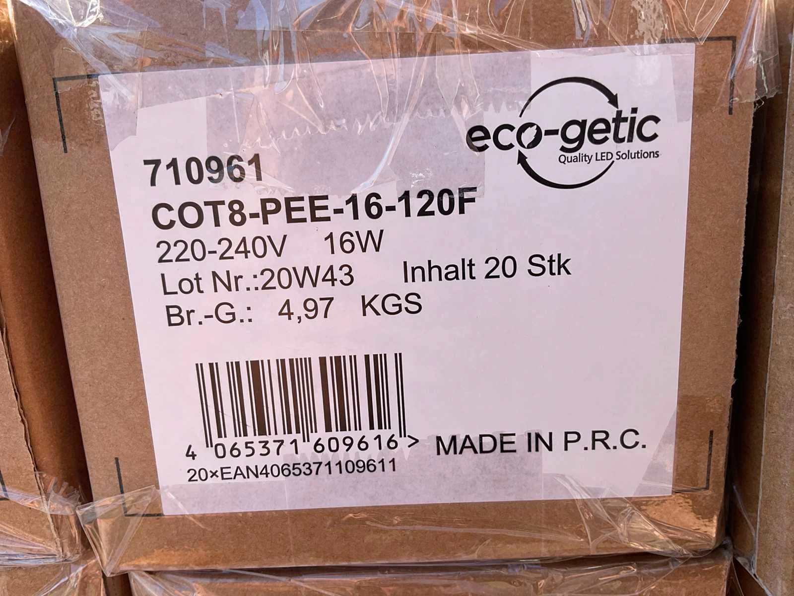 De Eco-Getic LED Tube T8 is een energiezuinige vervanger voor traditionele TL-buizen. Met een lengte van 1212 mm en een koelwitte lichtkleur (4000K). Type: LED Tube T8. Lengte: 1212 mm (Ø28 mm). Vermogen: 16W. Lichtopbrengst: 2400 lumen. Lichtkleur: 4000K koel wit. Fitting: G13. Kleurweergave (CRI): Ra ≥80. Levensduur: 50.000 uur. Aantal schakelcycli: 100.000 Temperatuurbereik: -30°C tot +45°C Instant full light: direct 100% licht, zonder opwarmtijd. Compatibel met conventionele voorschakelapparatuur (EM), elektronische voorschakelapparatuur (HF) en directe netspanning (Mains). Let op, dit kavel heeft een totale voorraad van 400 Led Tubes. Deze zijn verdeeld over 20 dozen van 20 stuks. Merk: Eco-getic Model: T8 Product type: Led Tube Vorm: rond Spanning: 220-240V Kleurtemperatuur: 4000K Lichtbron: LED Lichtopbrengst: 2400lm Diameter circa: 28mm Fitting: G13 Wattage: 16W Lengte: 121,2cm Breedte: 2,8cm Hoogte: 2,8cm Materiaal: aluminium, kunststof