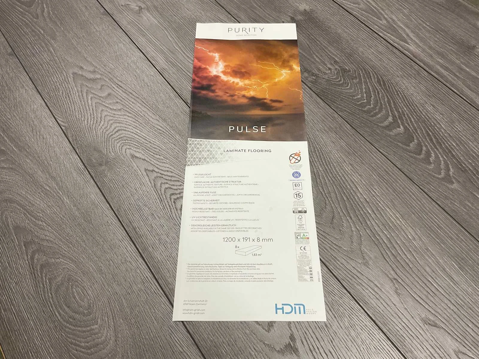 Pulse Eiken antraciet laminaat van het merk Purity à 1,83m² per pak = totaal van 1,83m². Merk: Purity Model: Pulse Product type: Laminaat Oppervlakte: 1.83m² Geschikt voor vloerverwarming: true V-groef: true Aantal m² per verpakking: 1.83m² Kleur: Eiken antraciet Gewicht: 13.2kg Lengte: 1200mm Breedte: 191mm Hoogte: 8mm Materiaal: HDF