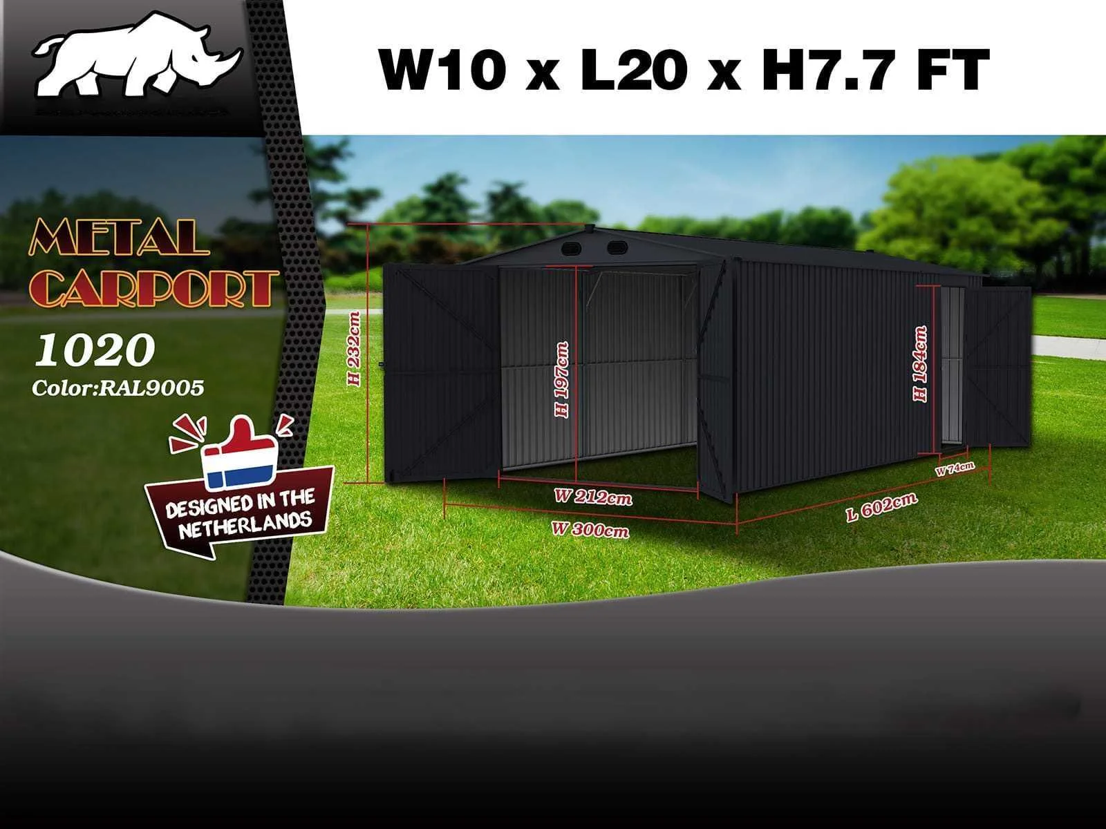 Voorzien van afmetingen 602x300x232cm (lxbxh); Dubbele scharnierdeuren aan de voorzijde; H197xW212cm ; Enkele scharnierdeuren aan de vzijkant 184×74cm (hxb); Let op kleur zwart Ral 9005 !; Ongebruikt Merk: Rhino-Cross-Garages Type: 6,02x3x2,32 m Bouwjaar: 2025