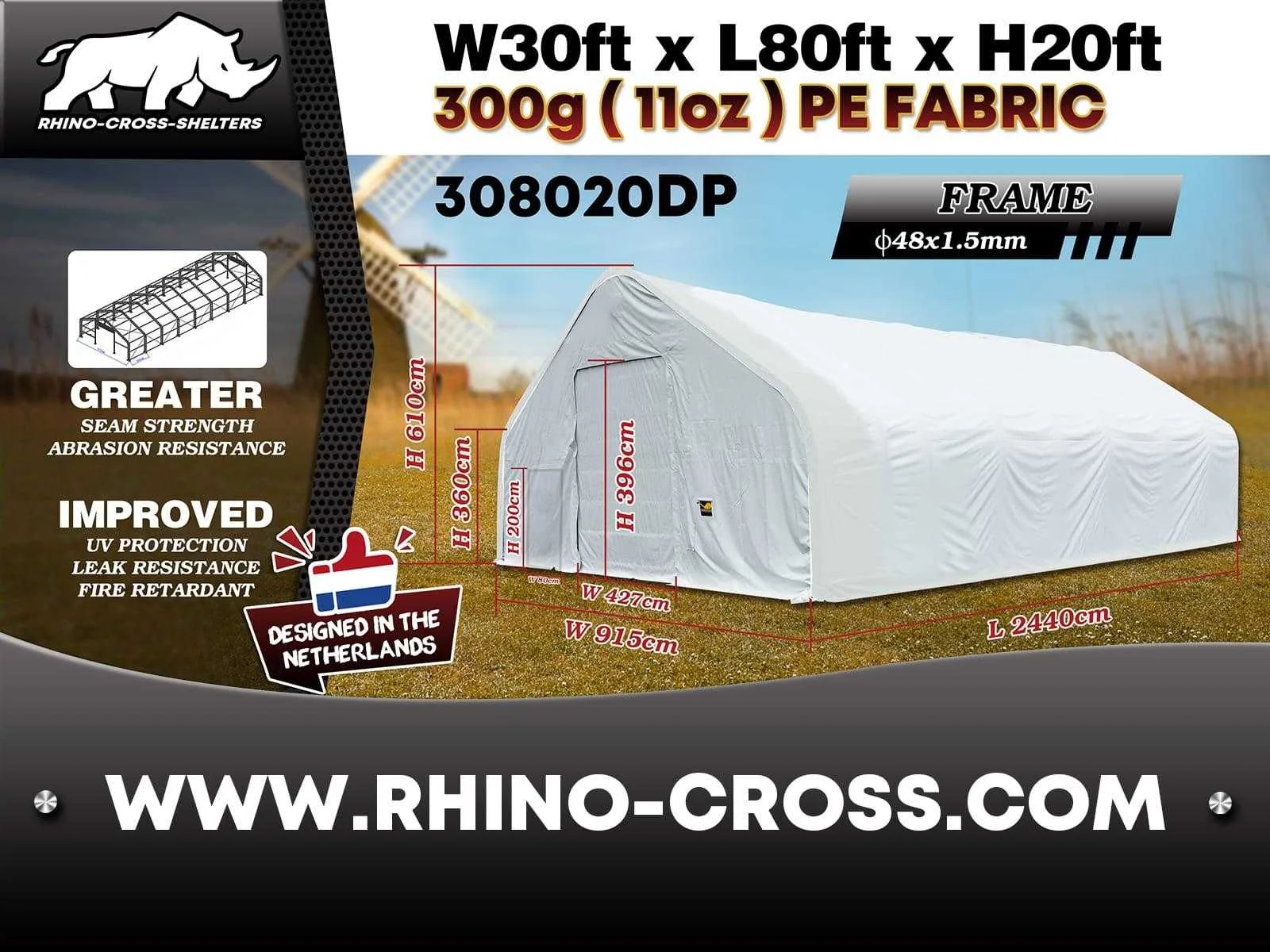 Voorzien van opslagtent / opslag shelter; dubbel trussen-/buizensysteem; gegalvaniseerd; beide uiteinden een deur; materiaal 300 gram PVC cover; kleur wit; inclusief montage handleiding; ongebruikt in metalen kist (transport afmetingen 315x110x153 cm) Merk: Rhino-Cross-Shelter Type: 308020DP - 24,4x9,15x6,1 m Bouwjaar: 2025 Eigen gewicht: 2040kg Totale afmeting L: 24400mm Totale afmeting Breedte: 9150mm Totale afmeting Hoogte: 6100mm