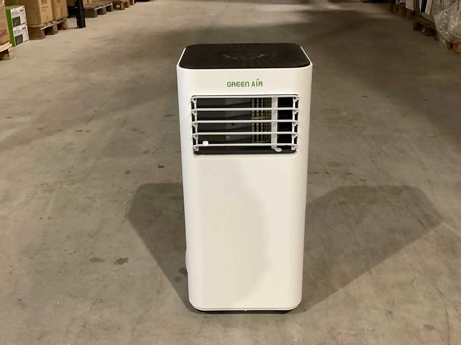 Voorzien van Mobiele airco; Geschikt voor ruimte tot 35 m²; Koelvermogen btu 9000; Energieverbruik niveau A; Vermogen 1005 W; Snoerlengte 2 m; Verstelbare luchtuitlaat; Met wielen; Automatisch uitschakelen; Aan-uit schakelaar; Indicatielampje; Timer; Afstandsbediening; Luchtreinigingsfunctie; Ontvochtigingsfunctie; Verkoelingsfunctie; Diameter afvoerpijp 30 mm; Energieverbruik 2.5 kW; Lucht Filter; Geschikt voor 90 m³; Inclusief raamafdichtingskit; Lengte afvoerslang 200 cm; Maximale geluidsproductie: 54 dB; Ontvochtigingsfunctie; Verrijdbaar; Ongebruikt in doos Merk: Green Air Type: GR-A1.9000B Bouwjaar: 2025 Koelcapaciteit (BTU/h): 9000 Koelcapaciteit (W): 1005 Aansluiting: 220V Eigen gewicht: 25.1kg Totale afmeting L: 380mm Totale afmeting Breedte: 355mm Totale afmeting Hoogte: 90mm