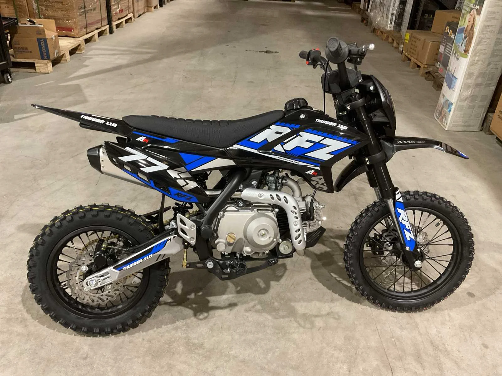 Voorzien van 110 cc motor; 4 takt; kick start; bandenmaat voor 14” inch achter 12” inch; hydraulische vering voor en achter; schijfremmen; verlichting; ongebruikt in doos (transport afmetingen 130x40x70 cm) Merk: Ultra Motocross Type: Thunder 110 BL Brandstof: Benzine Cilinderinhoud: 110cc Gewicht: 83kg Kleur: Blauw Transmissie: Automaat Aantal sleutels: 2