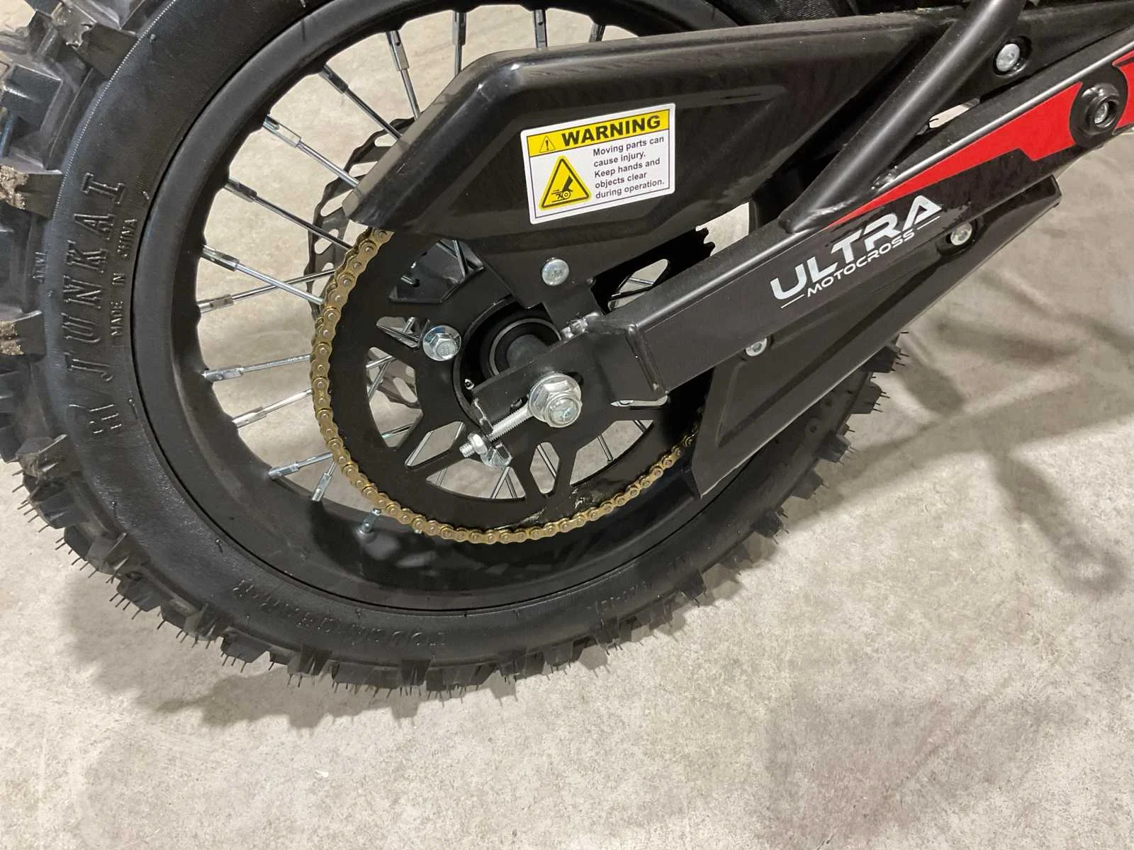 Voorzien van Accu: 48V13Ah lithium; Transmissie: intelligente controller, instelbaar in 2 functies; Gasrespons instelbaar van 0,2S tot 1,0S; Maximale snelheid instelbaar van 10 km/u - 55 km/u (1800W); Eindaandrijving: voor 10T / achter 76T; Actieradius per volle lading (13Ah lithium accu): ~24 km; Velg & banden: Velg met stalen spaken, voor 14" en achter 12"; Band: voor 2,75-14" / achter 3,00-12"; Max. Snelheid: 55 km/u (1800 W); Max. draagvermogen: 65 kg; Remsysteem: mechanische rem/schijf voor en achter (Ø 180 mm); Vering: hydraulische upside-down vork en monoshock achter; Afmetingen (L*B*H): 1470*640*920 mm; Wielbasis: 1010 mm; Zithoogte: 680 mm; Minimale bodemvrijheid: 300 mm; Gewicht: 38 kg; Ongebruikt in doos (Transport afmetingen 129x37x66cm 49kg) Merk: Ultra Motocross Model: ULD01 RO Type: 1800W 48v Gewicht: 39kg Kleur: Rood Bouwjaar: 2025