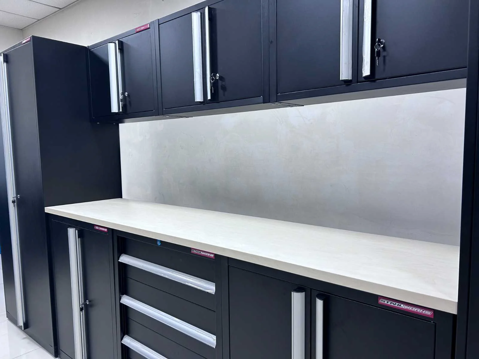 Voorzien van poeder coating; 30 mm houten werkblad; kleur zwart; ongebruikt in dozen (transport afmeting 1,5 m3) Merk: Stahlworks Model: TC-261 Product type: 405x55x203 cm Materiaal: SPCC steel