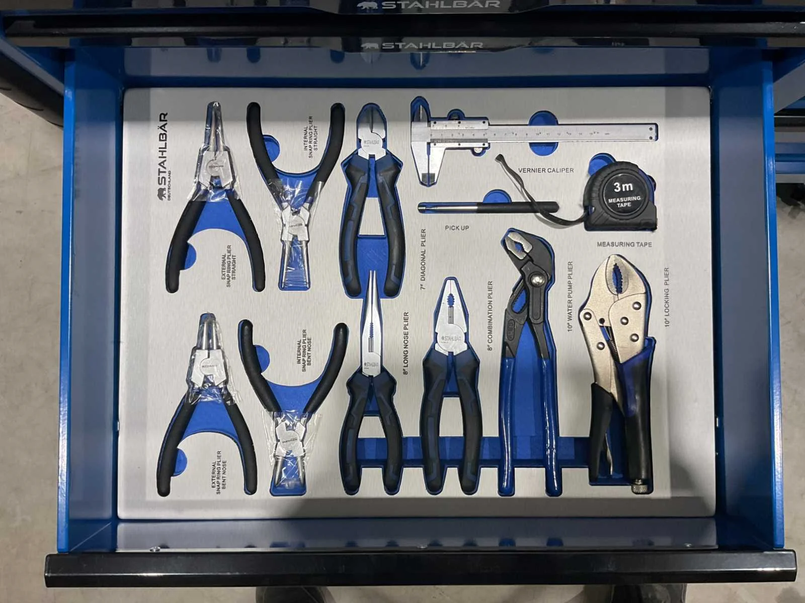 Voorzien van 13 lades waarvan 10 gevuld met gereedschap; professioneel chroom-vanadium gereedschap; heavy duty gereedschapswagen; houten werkblad; 4 wielen; stevig handvat; ongebruikt in doos (transport afmetingen 115x50x100 cm) Merk: Stahlbär Type: Deutschland XXXL PRO Bouwjaar: 2025 Aantal laden: 13 Met inhoud: true Eigen gewicht: 138kg Totale afmeting L: 1150mm Totale afmeting Breedte: 500mm Totale afmeting Hoogte: 1000mm