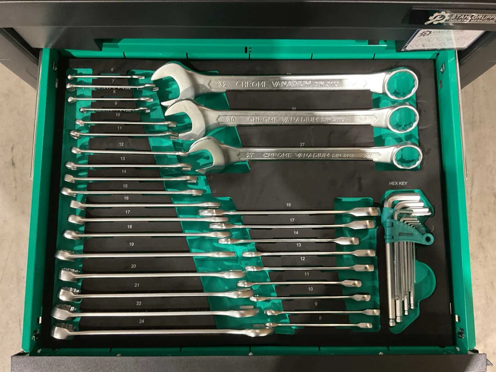 Voorzien van 7 lades waarvan 5 gevuld met gereedschap; professioneel chroom-vanadium gereedschap; heavy duty gereedschapswagen; stevig werkblad; 4 wielen; stevig handvat; ongebruikt in doos (transport afmetingen 80x50x105 cm) Merk: Stahlgruppe Type: SG9 Bouwjaar: 2025 Aantal laden: 7 Met inhoud: true Eigen gewicht: 78kg Totale afmeting L: 800mm Totale afmeting Breedte: 500mm Totale afmeting Hoogte: 1050mm