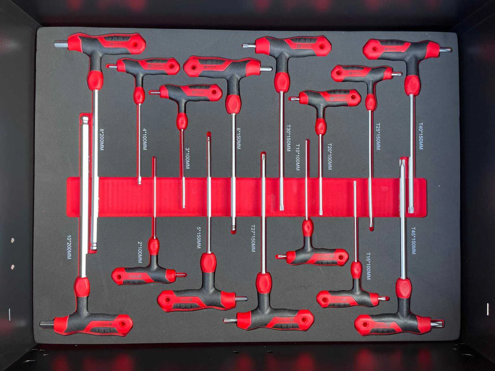 Gevulde gereedschapswagen; aantal gevulde laden: 11 gevulde laden; gereedschap: chrome vanadium; inhoud: 2 dopsleutel sets, momentsleutel, ringsteeksleutel set 6-32, ringratelsleutel 8-19, inbussleutel set, ringsleutel set 6-32, torx sleutel set T8-T70, schroevendraaier set (21 stuks), tangen set (9 stuks), beitel en doorslagen set (18 stuks), vijlen set (5 stuks), T-greep dopsleutel set 6-14, T-greep torx sleuel set T15-T45, hamers (3 stuks), VDE gereedschap (3 tangen en 7 schroevendraaiers), kabelschoentang set, enzovoort; staat: ongebruikt in doos Merk: Stahlgruppe Type: Jumbo R Bouwjaar: 2024 Aantal laden: 13 Met inhoud: true Eigen gewicht: 138kg Totale afmeting L: 1100mm Totale afmeting Breedte: 620mm Totale afmeting Hoogte: 1120mm