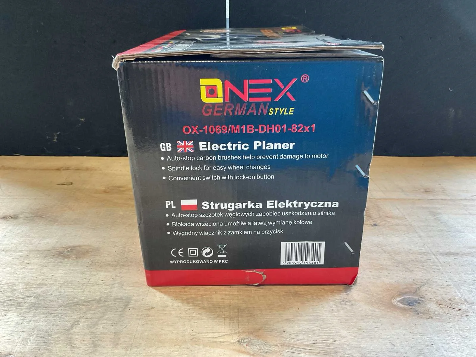 Afmeting verpakking 350x165x180mm Merk: Onex German Style Model: OX-1069 Vermogen: 950W Toerental: 16000rpm Schaafbreedte: 82mm Gewicht: 2.66kg Spanning: 220V