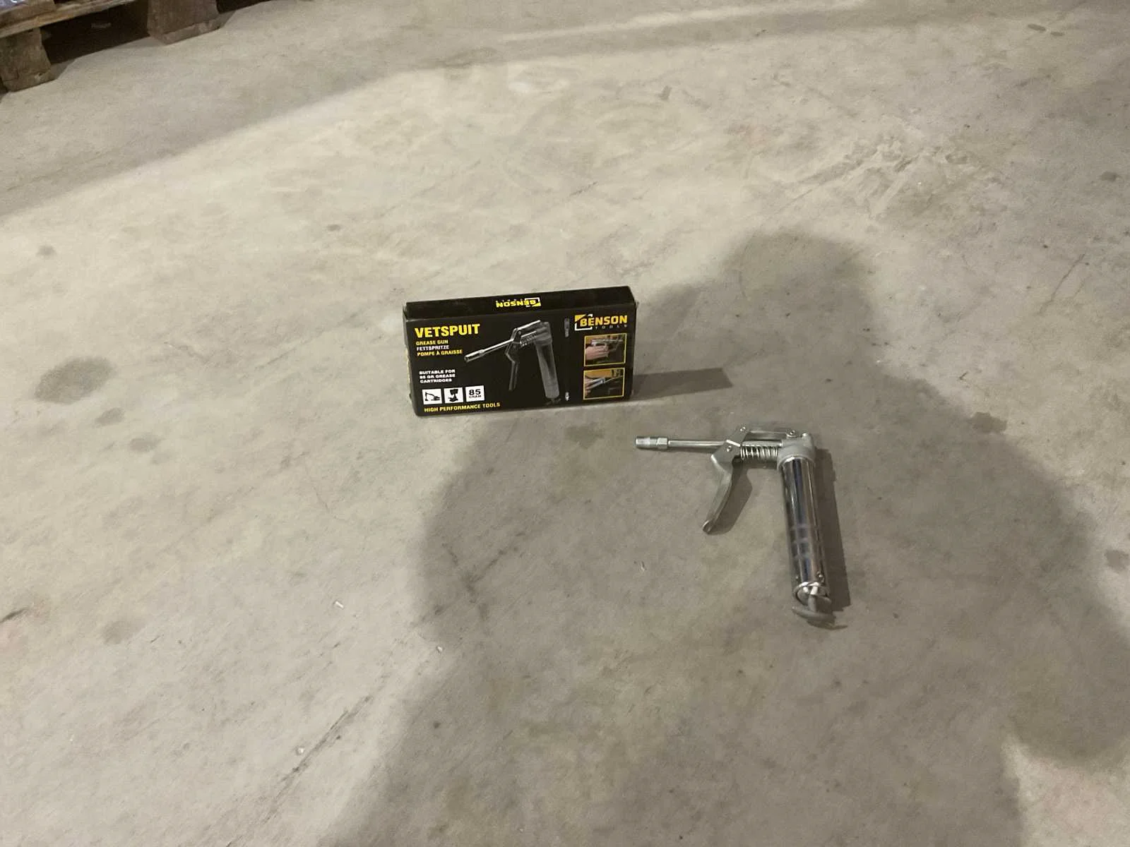 Voorzien van vetspuit; geschikt voor 85 gram vetpatronen; flexibele slang; vaste pijp 145 mm; ongebruikt in doos Transport afmeting 270 x 135 x 40, Gewicht 0.62 kg ) Merk: Benson tools Type: 010391 Bouwjaar: 2025 Afmeting l: 270mm Afmeting b: 135mm Afmeting h: 40mm Eigen gewicht: 0.09kg Totale afmeting L: 270mm Totale afmeting Breedte: 40mm Totale afmeting Hoogte: 135mm