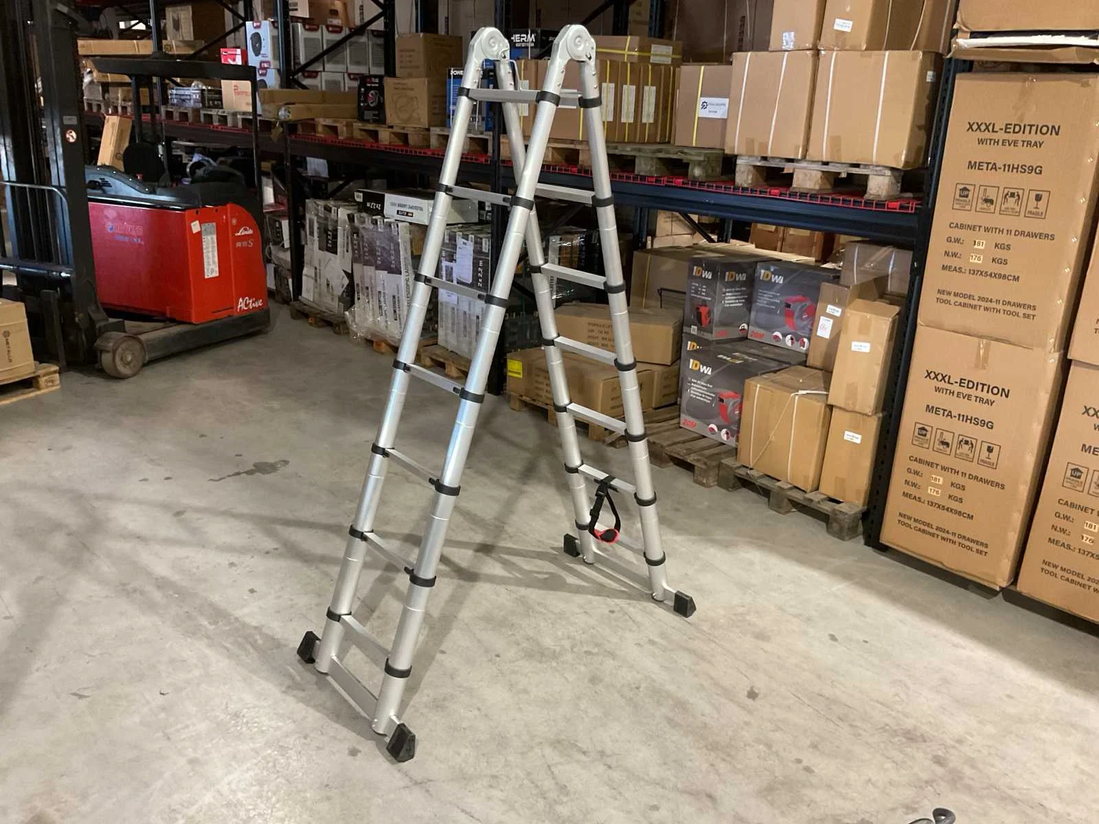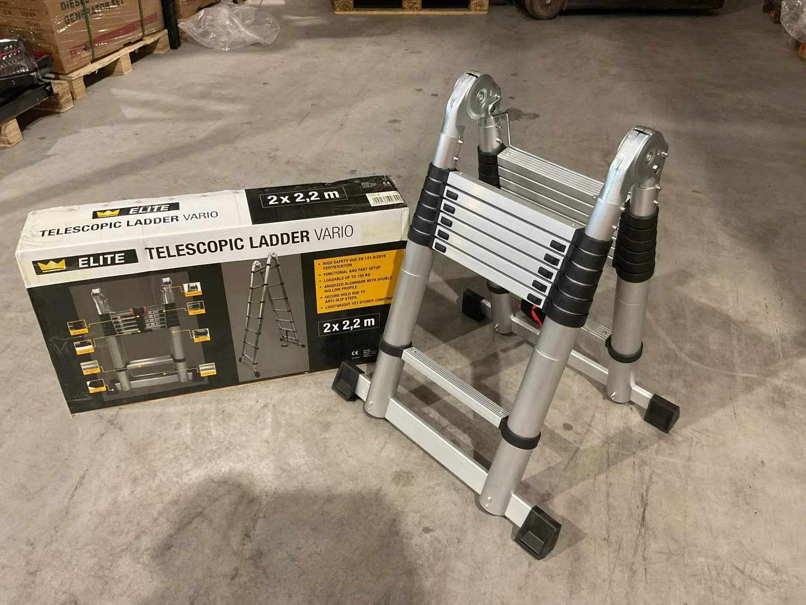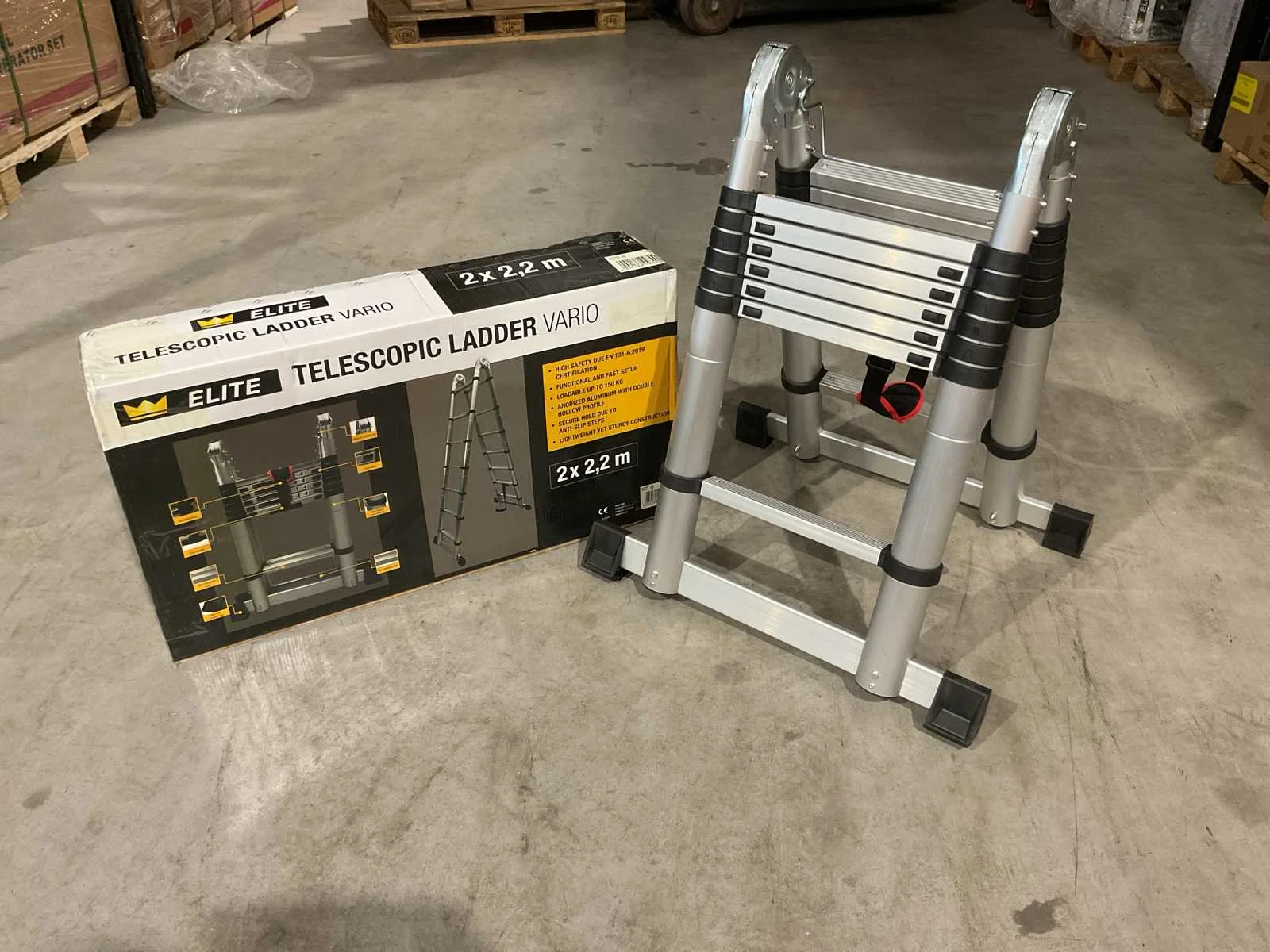 Voorzien van anti slip tredes; veiligheid band; ongebruikt in doos (transport afmetingen 90x50x20 cm) Merk: Elite Type: Vario 2x2,2 m Bouwjaar: 2025 Aantal treden: 16 Eigen gewicht: 18kg