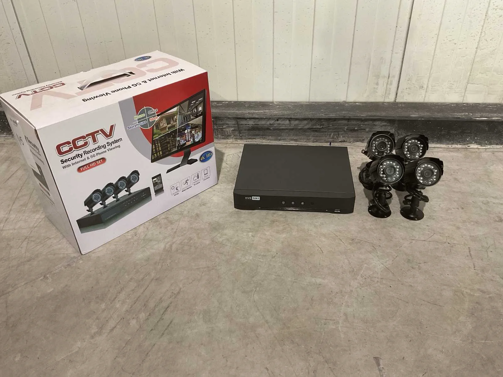 Voorzien van 4 camera’s; bewegingssensor; DVR; Resolutie VGA 1280X1024; 4 kabels 10mtr kabel; 2 x power adapter; 1 x muis; 2 x usb poorten; 1 x SATA harde schijf slot; netwerk aansluiting rj45; DC12V; video input: 4CH BNC; Video-output: 1x VGA, 1x CVBS, 1x HDMI; Audio input: 2 kanaal RCA; Audio output: 1ch RCA; 3.6 mm lens; kijkhoek: 60 graden; Nachtzicht: LED IR, 15M range; ongebruikt in doos Merk: CCTV Model: Security Recording system Product type: With internet & 5G phone viewing Kleur: Zwart Wifi: true Gewicht: 3kg Lengte: 34cm Breedte: 18cm Hoogte: 27cm