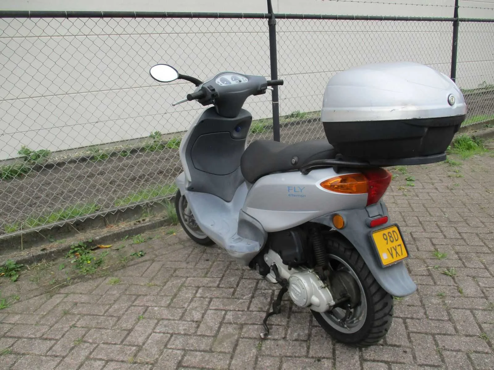 Bromscooter met 1 sleutel inclusief topkoffer (1 sleutel), motor loopt. Merk: Piaggio Model: Bromscooter Type: Fly 4T TEMPI Handelsbenaming: C44 Snelheid: 45km/h Kenteken: 98-DVX-7 Datum eerste toelating: 2007-09-07 Bouwjaar: 07-09-2007 Transmissie: Automaat Brandstof: benzine Kleur: niet van toepassing Afgelezen kilometerstand: 22721km