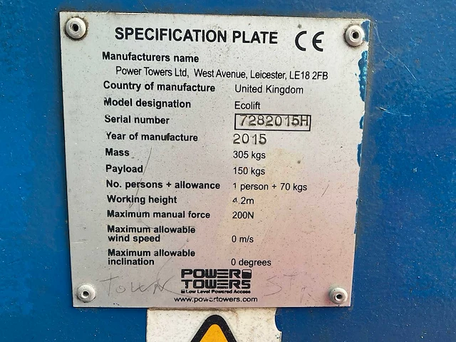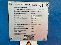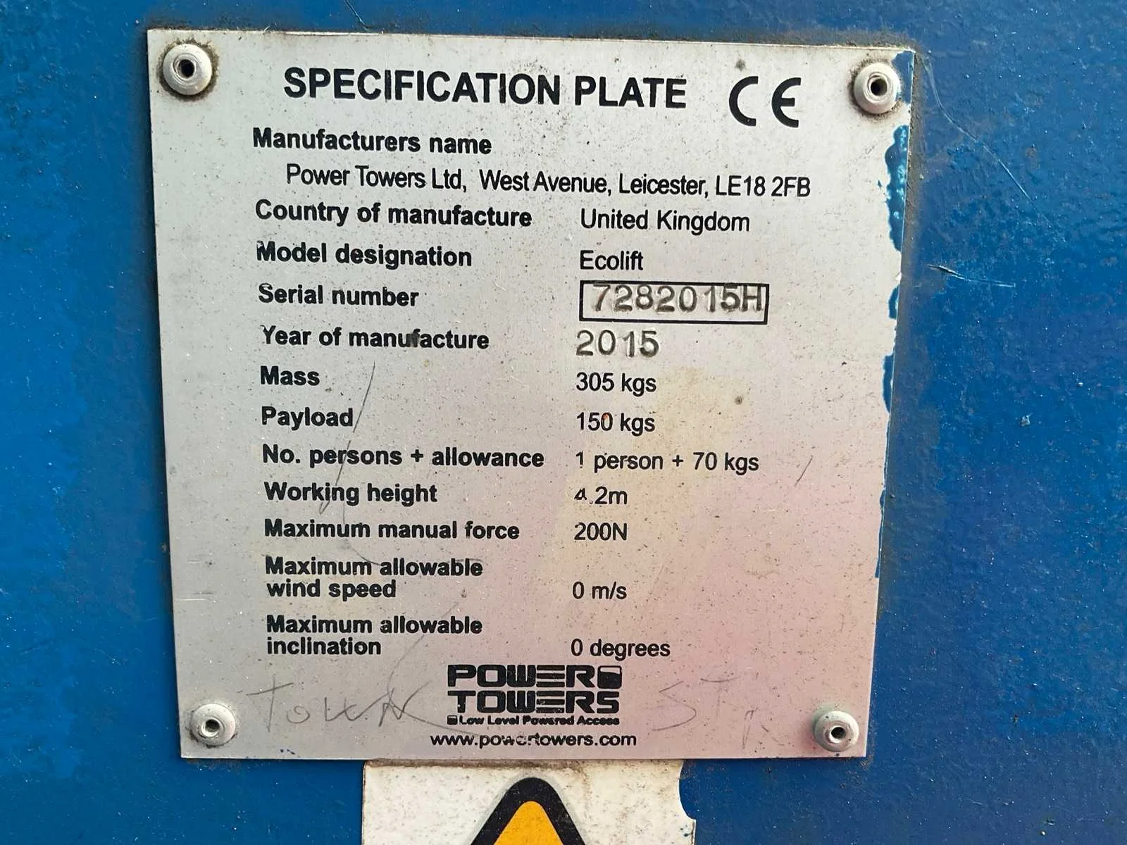 Machines afkomstig van faillissement of bedrijfsbeëindiging, wij adviseren u om de kijkdag te bezoeken om de staat en conditie van het kavel zelf te beoordelen Merk: Power tower Type: EcoLift Bouwjaar: 2015 Telescoop hoogwerker: true Masthoogwerker: true Platform capaciteit: 150kg Eigen gewicht: 305kg