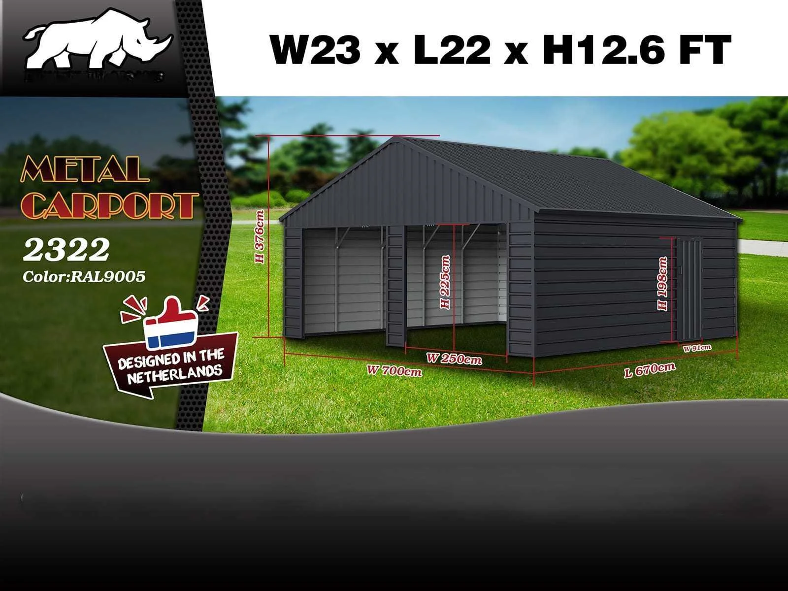 Voorzien van Afmeting: 7x6.7x3.76m (bxlxh); Vloeroppervlakte: 47 m2 (Ongeveer.); Zijwand hoogte 2.44m; Top Hoogte: 3.85 m; Hoogte dakrand: 2.44m; Deuropening: 2.5x2.25 (bxh), geen voordeur, gewoon open.; Zijdeur: B0.91*H1.98m Kruisnerf 3 lagen splitsing; Stalen frame: 16 GA (1.6mm); Metalen dek laken: 0.32-0.38mm; Verankering: expansiebouten; Fundering benodigd: Beton platen, massief hout of soort gelijk; Let op kleur zwart Ral 9005!; Ongebruikt Merk: Rhino-Cross-Garages Type: 6,7x7x3,76 m Bouwjaar: 2025