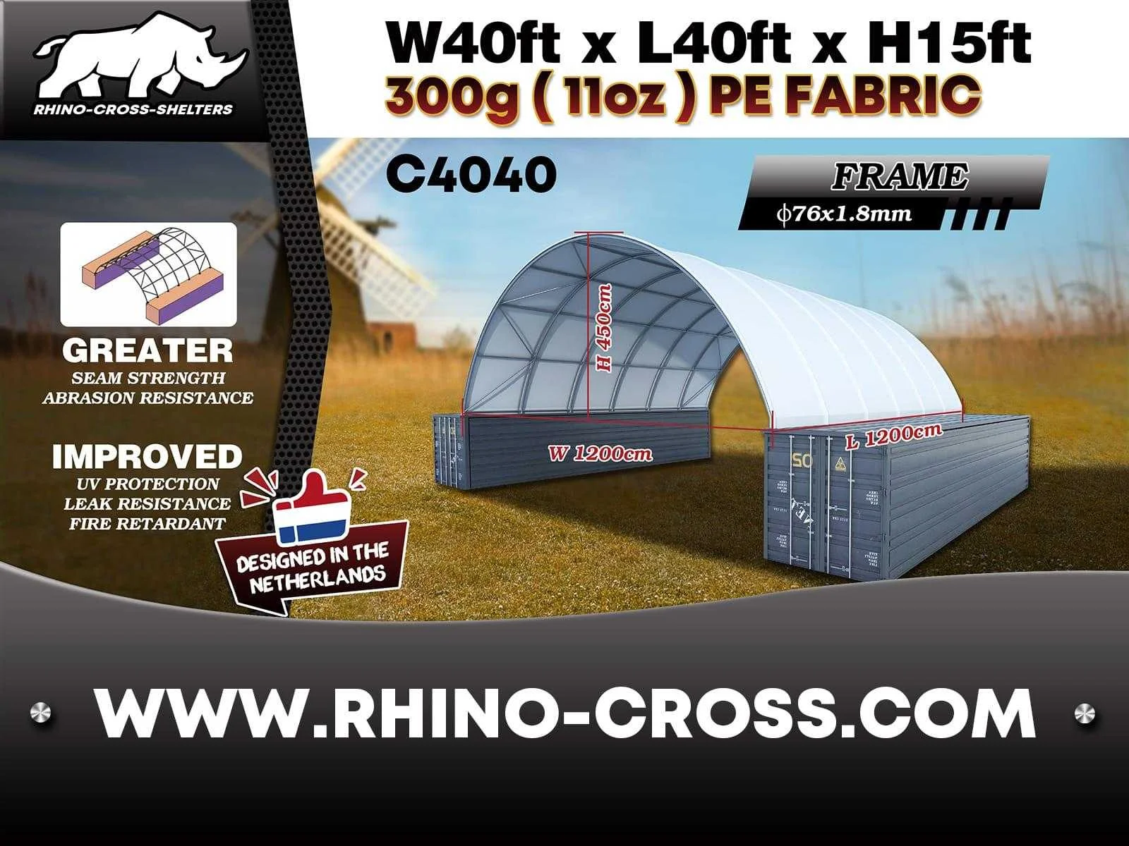 2025 rhino-cross-shelter c4040 - 12x12x4,5 m opslagtent tussen 2 containers