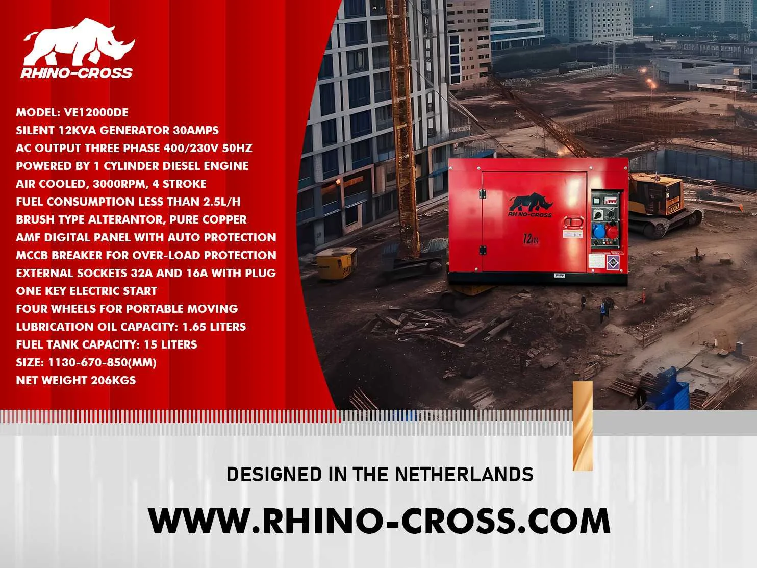 Voorzien van diverse toebehoren; Capaciteit.: 12kVA; Diesel motor; Lucht gekoeld; 400/230v; 3000rpm; Verbruik van 2.5l/u; Electrische start; Voorzien van zwenk wielen; Machinegewicht: 206kg Totale afmeting 1130x670x850 (lxbxh); Ongebruikt in doos Merk: Rhino-cross Type: VE12000DE Bouwjaar: 2025 Capaciteit.: 12kVA Diesel: true Luchtgekoeld: true Mobiel: true Machinegewicht: 206kg Totale afmeting L: 1130mm Totale afmeting Breedte: 670mm Totale afmeting Hoogte: 850mm