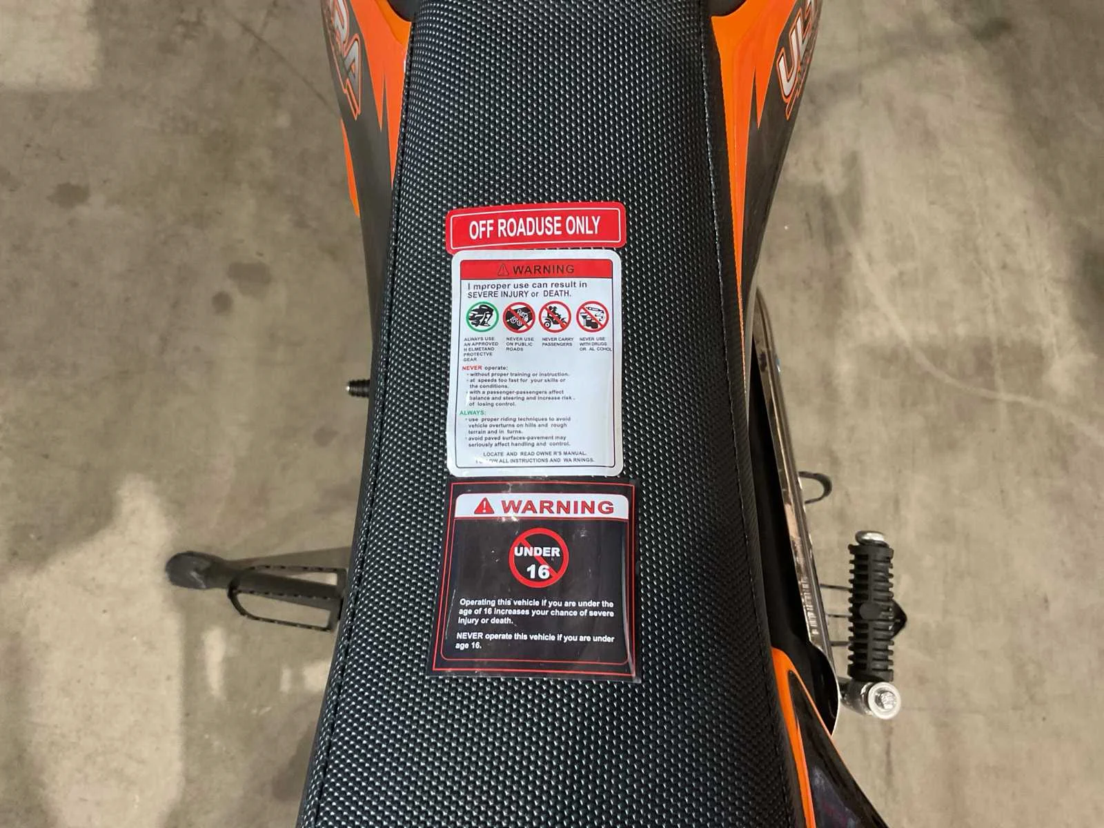 Voorzien van 110cc motor; Manuele koppeling; kickstart; Wiel/velg: V: 90/100-14 (14") A: 70/100-17 (17"); Hydraulische schijfrem; olieschokdemper; Enkele stalen uitlaatpijp; Maximale snelheid: 70 km/u; Ongebruikt in doos (Transport verpakking: 1295 x 375 x 620 mm 75kg) Merk: Ultra Motocross Model: DB001 OR Type: 110CC Cilinderinhoud: 110cc Gewicht: 68kg Kleur: Oranje zwarte zadel Transmissie: Manuele Bouwjaar: 2025