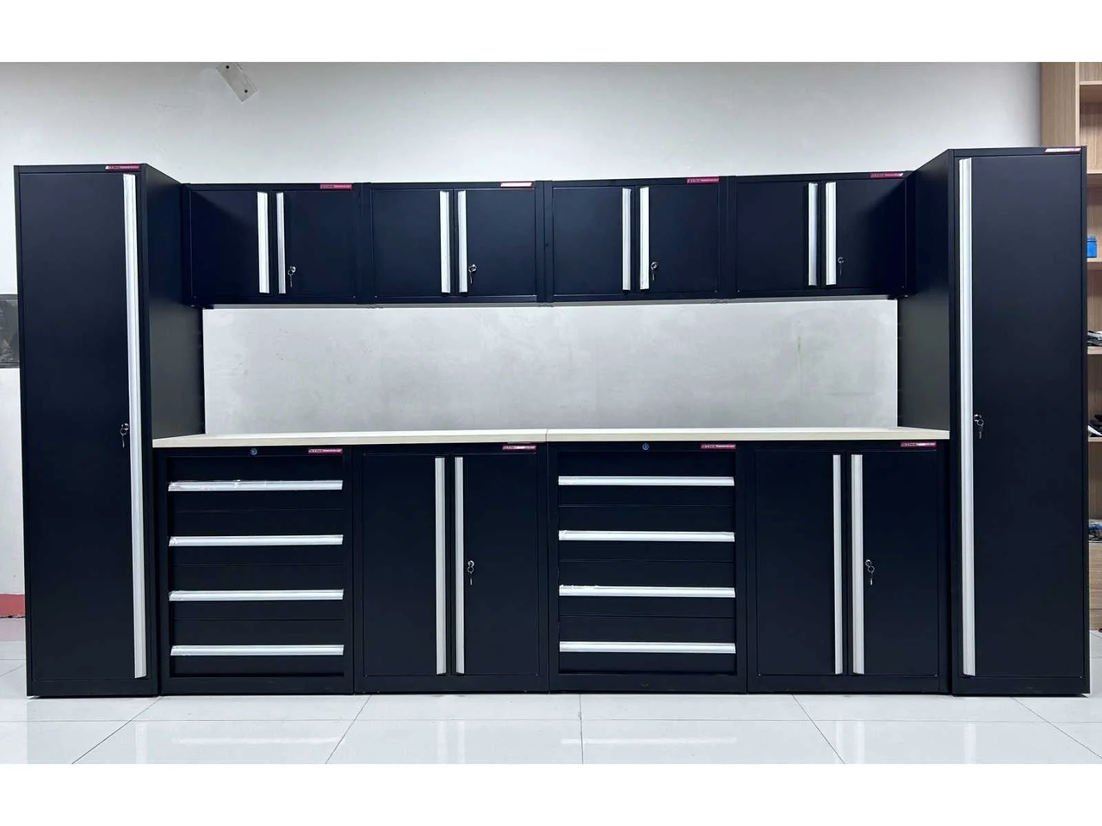 Voorzien van poeder coating; 30 mm houten werkblad; kleur zwart; ongebruikt in dozen (transport afmeting 1,75 m3) Merk: Stahlworks Model: TC-263 Product type: 400x55x203 cm Materiaal: SPCC steel