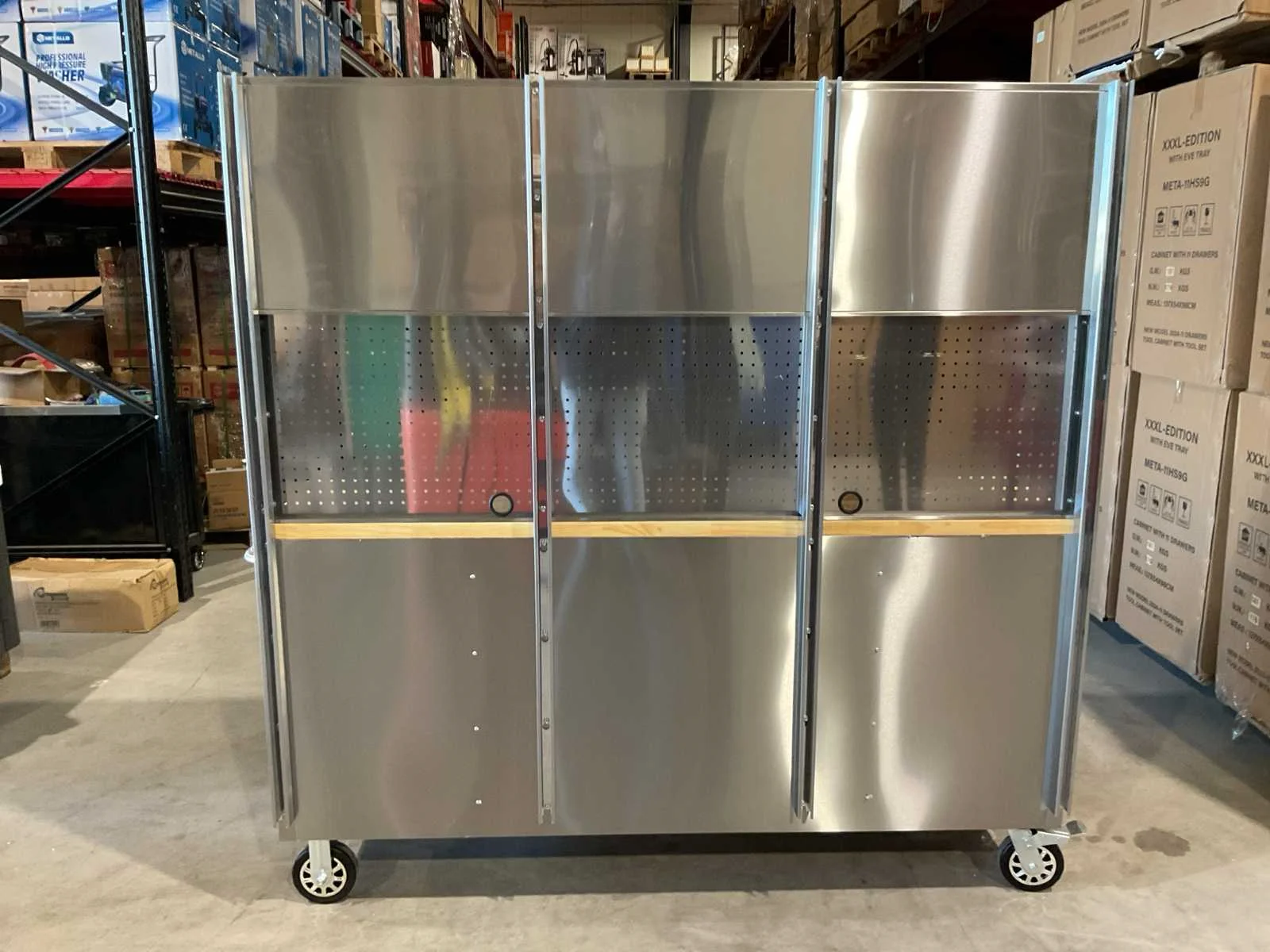 Voorzien van all 430 anti-fingerprint stainless steel; 15 laden; 3 hoge kasten; achterwand; 35 mm houten werkblad; 2 handvaten; 4 x 6 inch wielen waarvan 2 wielen met rem; afsluitbaar door middel van sleutel; ongebruikt in doos (transport afmetingen 190x55x130 cm) Merk: Stahlworks Model: Deluxe RVS 72 inch high Product type: 15 laden Gewicht: 179kg Lengte: 1830mm Hoogte: 1870mm Materiaal: RVS