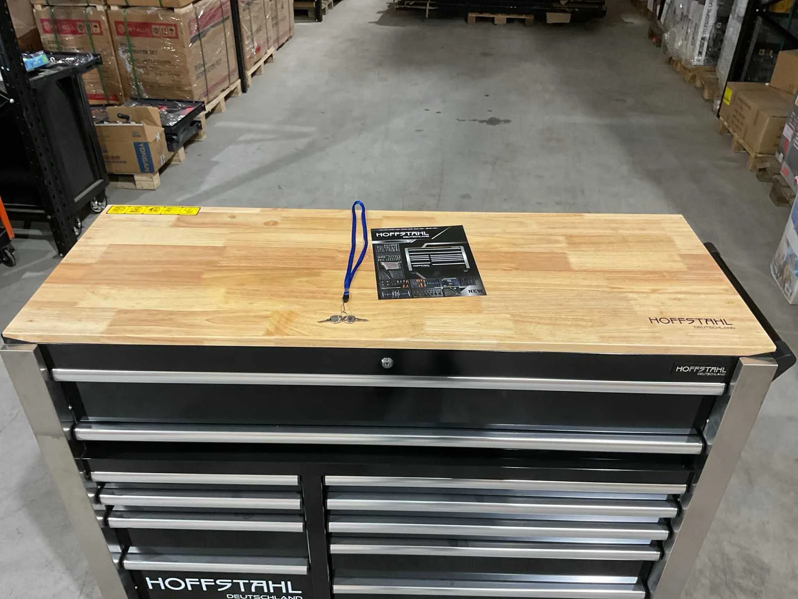 Voorzien van 11 lades waarvan 9 gevuld met gereedschap; professioneel chroom-vanadium gereedschap; heavy duty gereedschapswagen; houten werkblad; 4 wielen; stevig handvat; ongebruikt in doos (transport afmetingen 140x55x100 cm) Merk: Hoffstahl Type: Deutschland XXXL Bouwjaar: 2025 Aantal laden: 11 Met inhoud: true Eigen gewicht: 185kg Totale afmeting L: 1400mm Totale afmeting Breedte: 550mm Totale afmeting Hoogte: 100mm